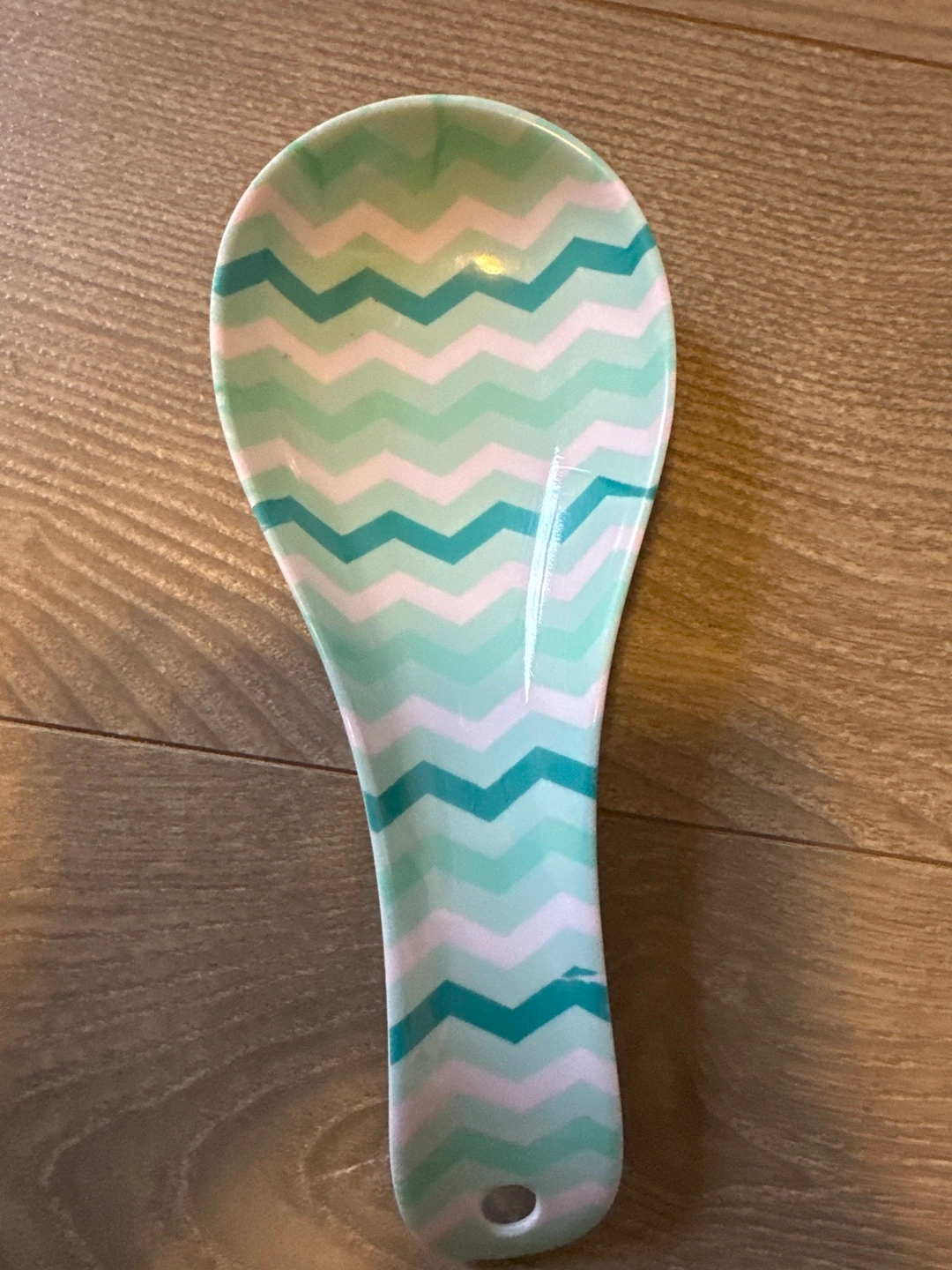 spoon rest. Features a teal and white chevron pattern. Perfect for adding a touch of style to your kitchen.