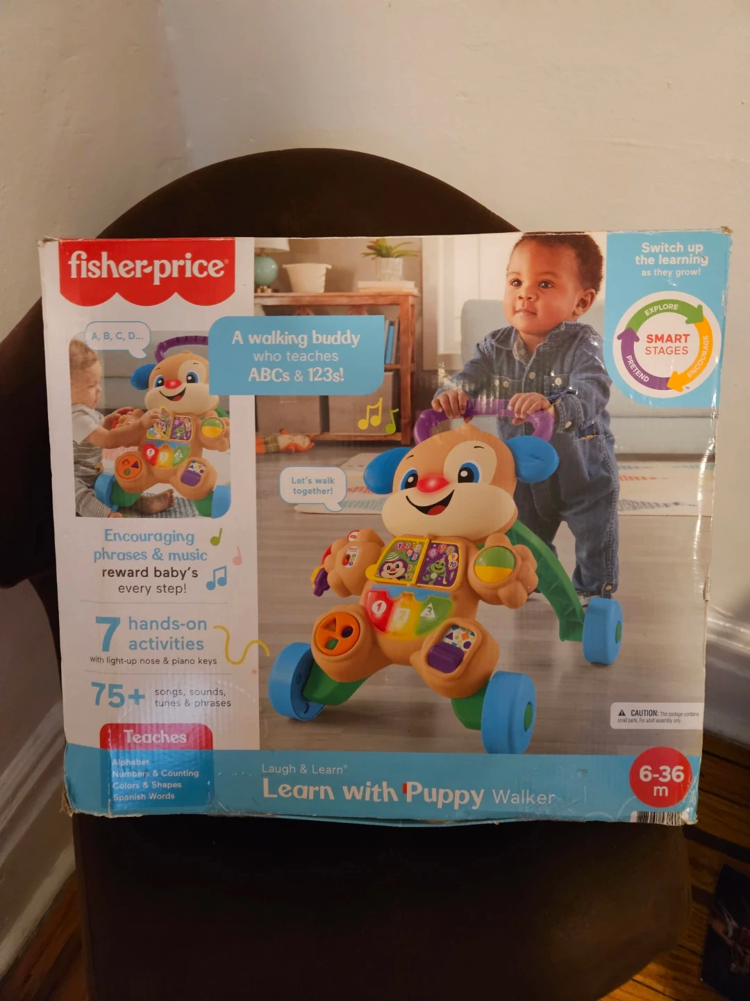 Fisher-Price Laugh & Learn walker that teaches ABCs and 123s. It has 7 hands-on activities with light-up nose and piano keys. Includes over 75 songs, sounds, tunes, and phrases. For ages 6-36 months.