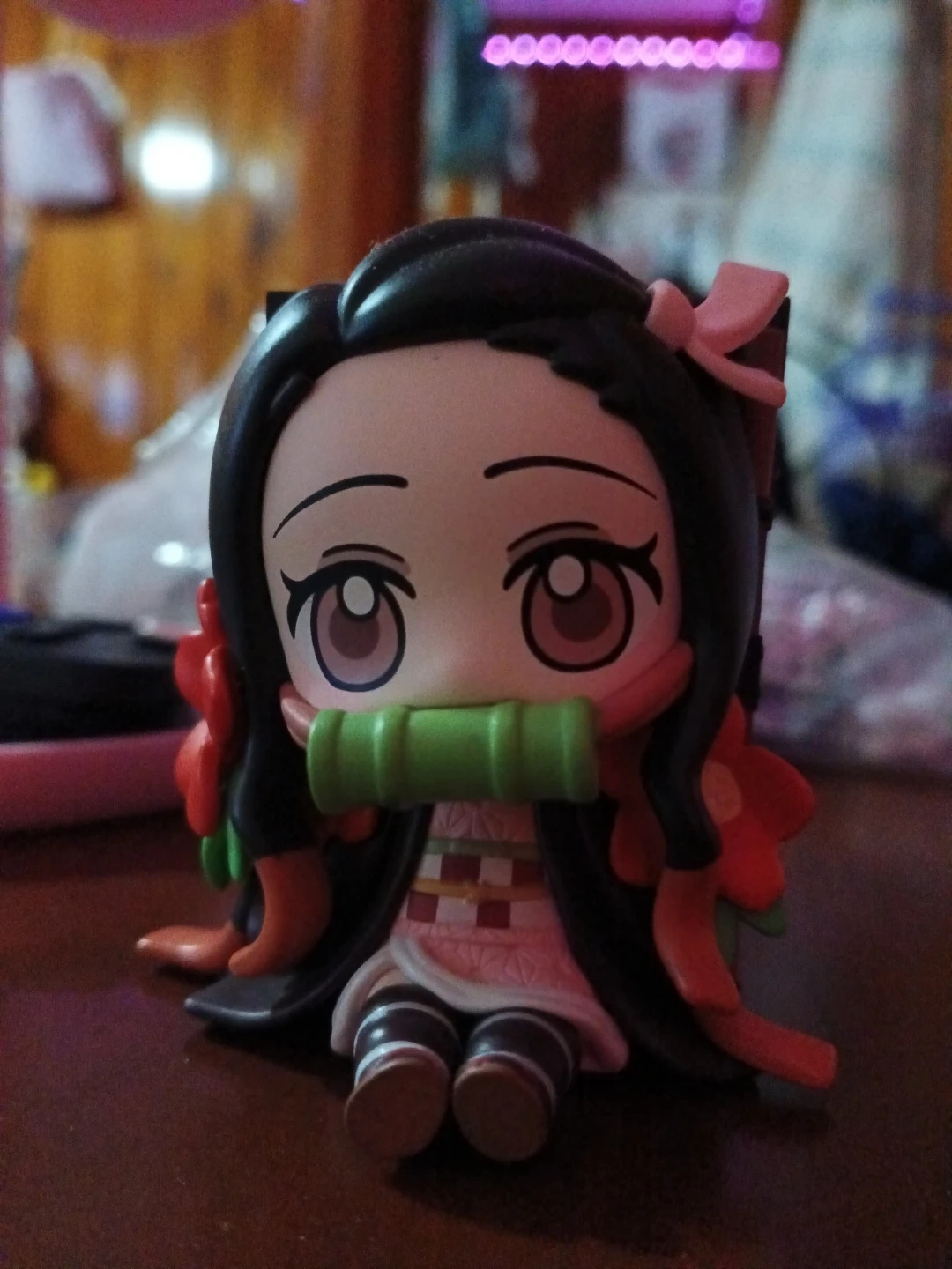 This is a cute chibi figure of Nezuko Kamado from Demon Slayer. It's made of plastic and features her iconic bamboo muzzle and pink bow. Great for any Demon Slayer fan!