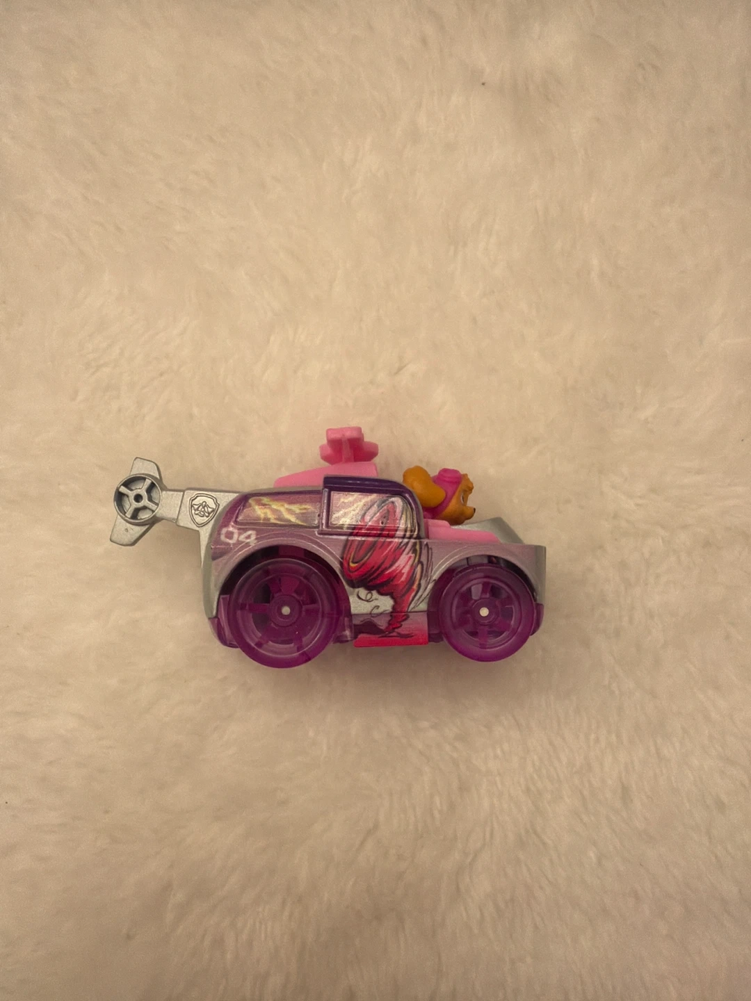 This is a Paw Patrol toy helicopter featuring Skye. It's pink and purple with cool graphics. This toy is great for young Paw Patrol fans!