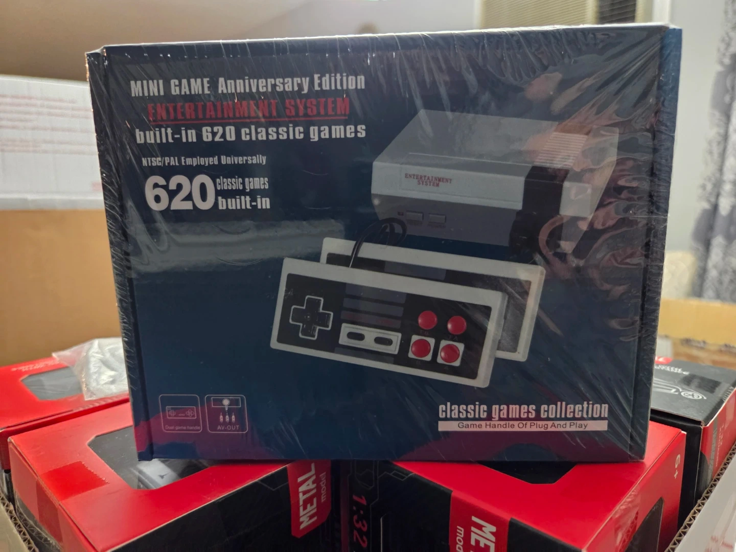This is a mini entertainment system with 620 classic games built-in. It's an anniversary edition with NTSC/PAL employed universally. Comes with dual game handles and AV-OUT.