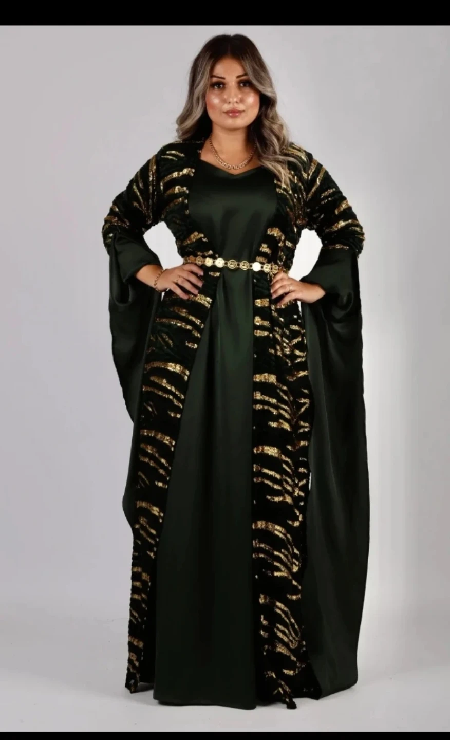Flowing abaya with intricate embroidery or dazzling sequin patterns. Features a luxurious velvet or satin finish. Comes with a stylish gold belt. Perfect for special occasions! Size M L And XL available pre-order for more styles pm price per dress start 250$