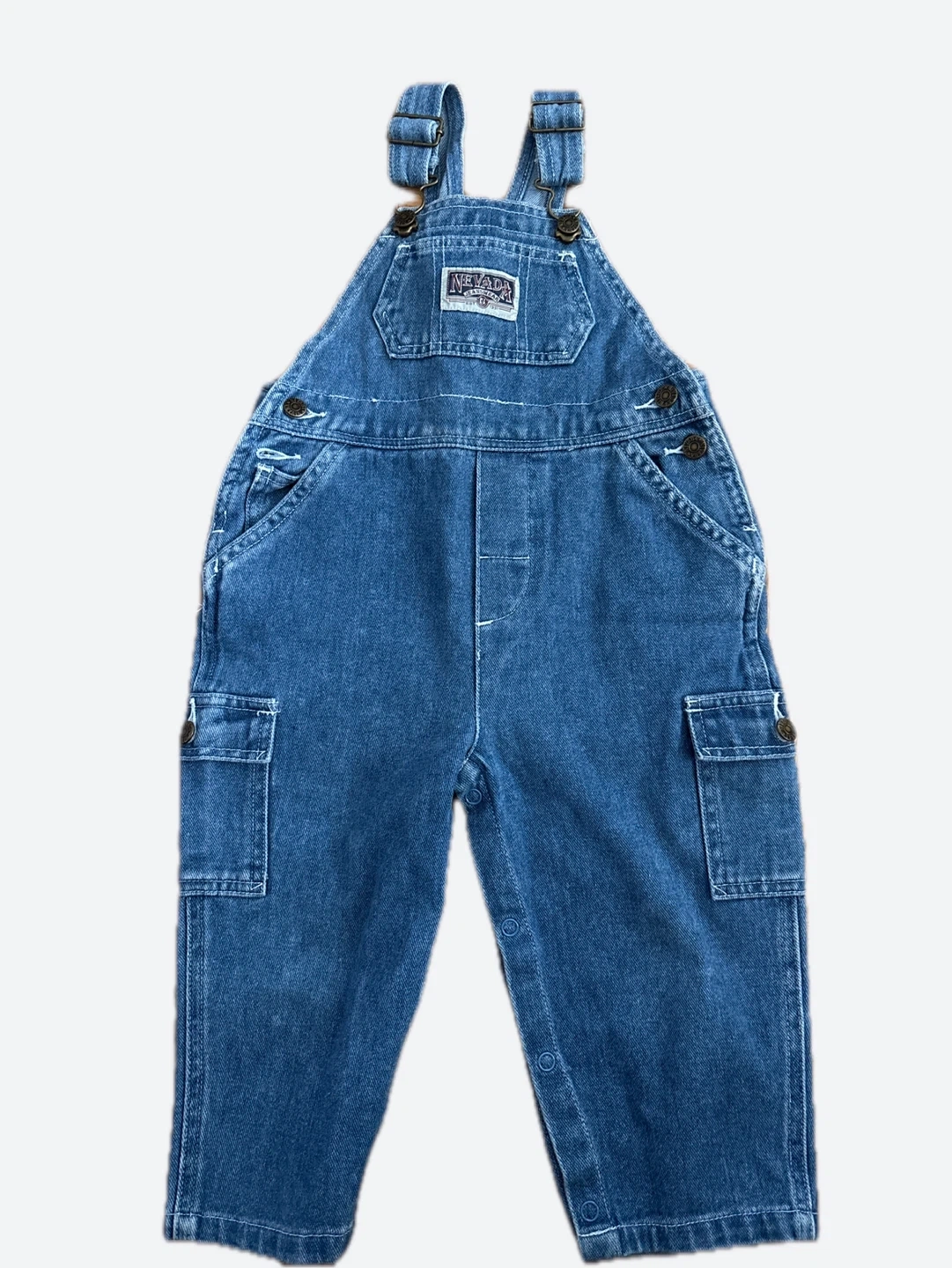 Toddler denim overalls by Nevada. Features adjustable straps and side snap closures. Denim material
