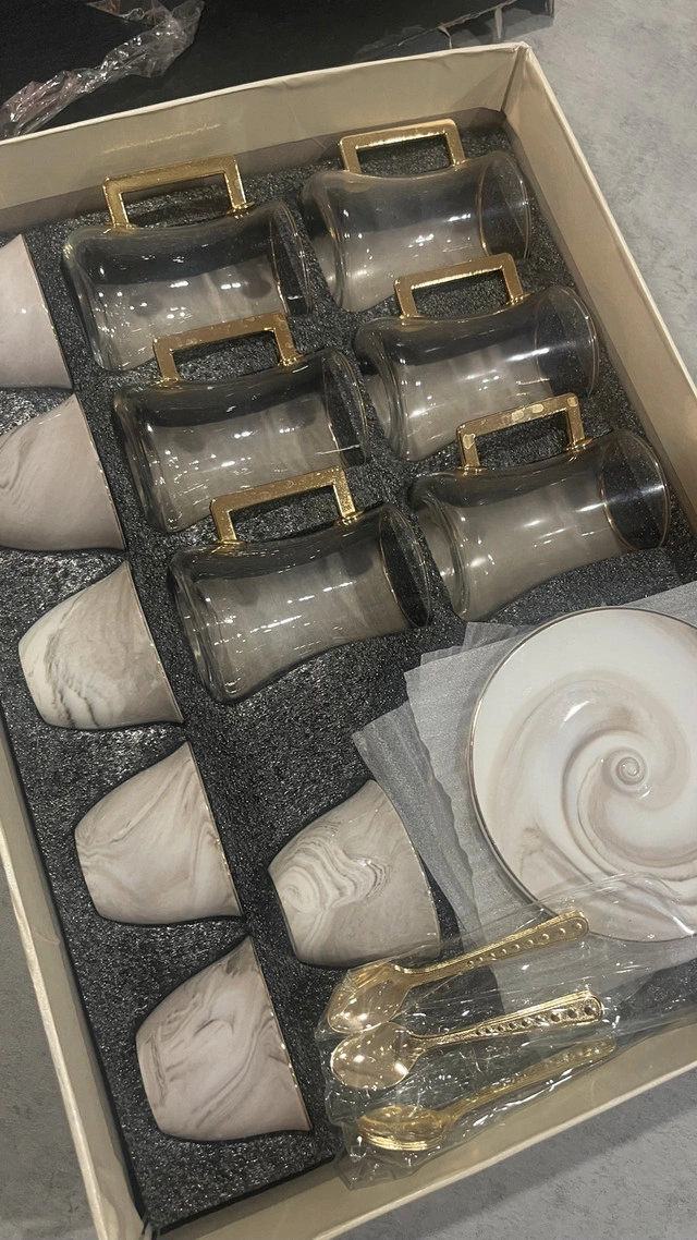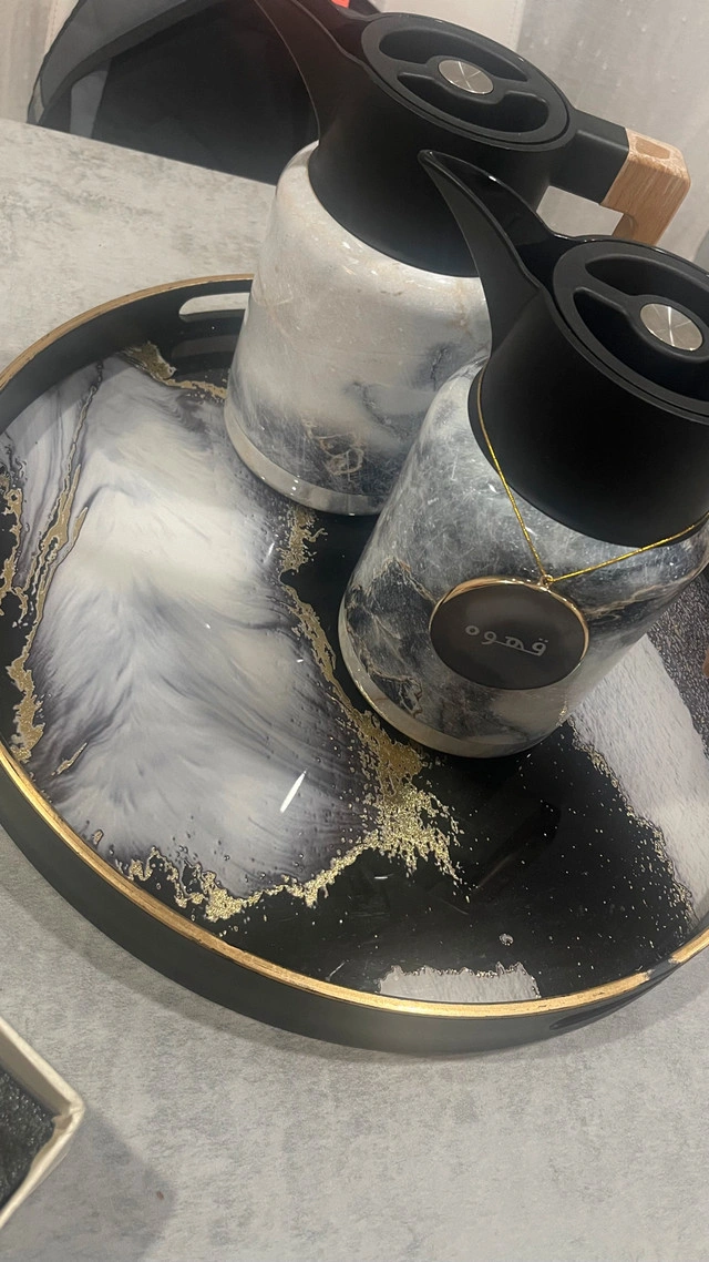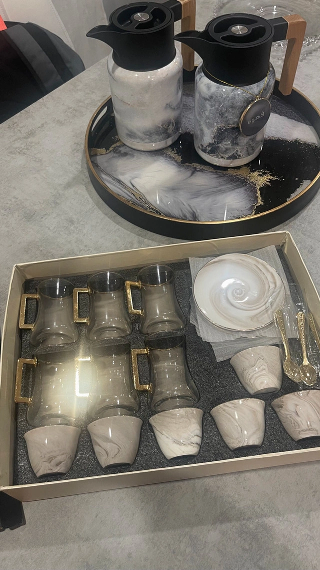 5This Arabic tea and coffee set is perfect for serving guests with style! The set features elegant marble-look accents and gold handles. It includes two thermal pitchers, a decorative tray, six tea and coffee cups, six spoons, and matching saucers. This set is in excellent condition, ready to elevate your tea or coffee service. Includes: * Two thermal pitchers * Decorative tray * Six tea/coffee cups * Six spoons * Matching saucers If you're seeing this ad, the set is still available!