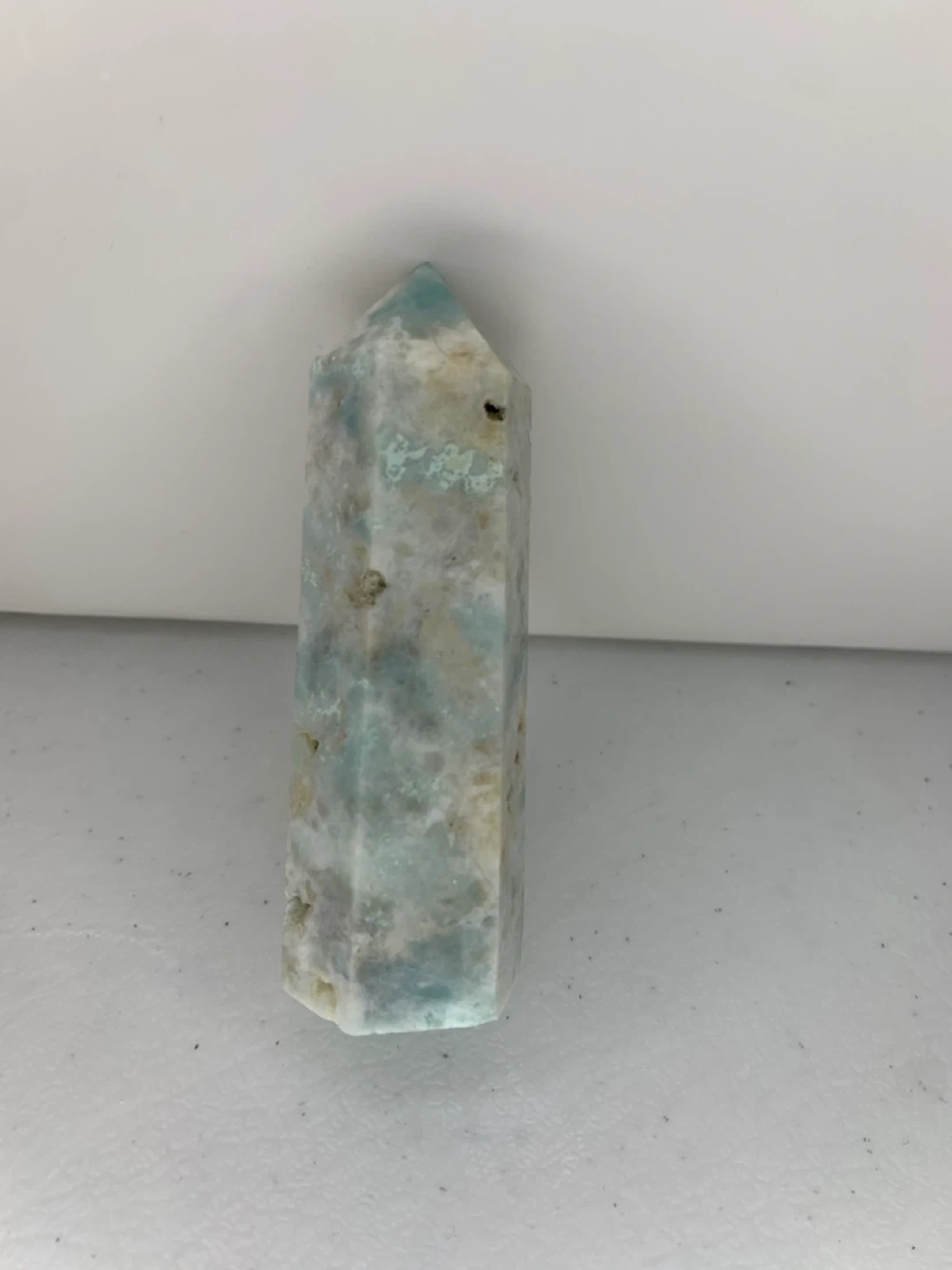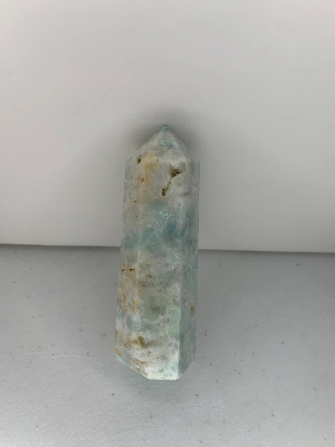 Selling an aragonite crystal tower. It has a beautiful mix of light blue, white, and beige tones. A lovely piece for any crystal collection!