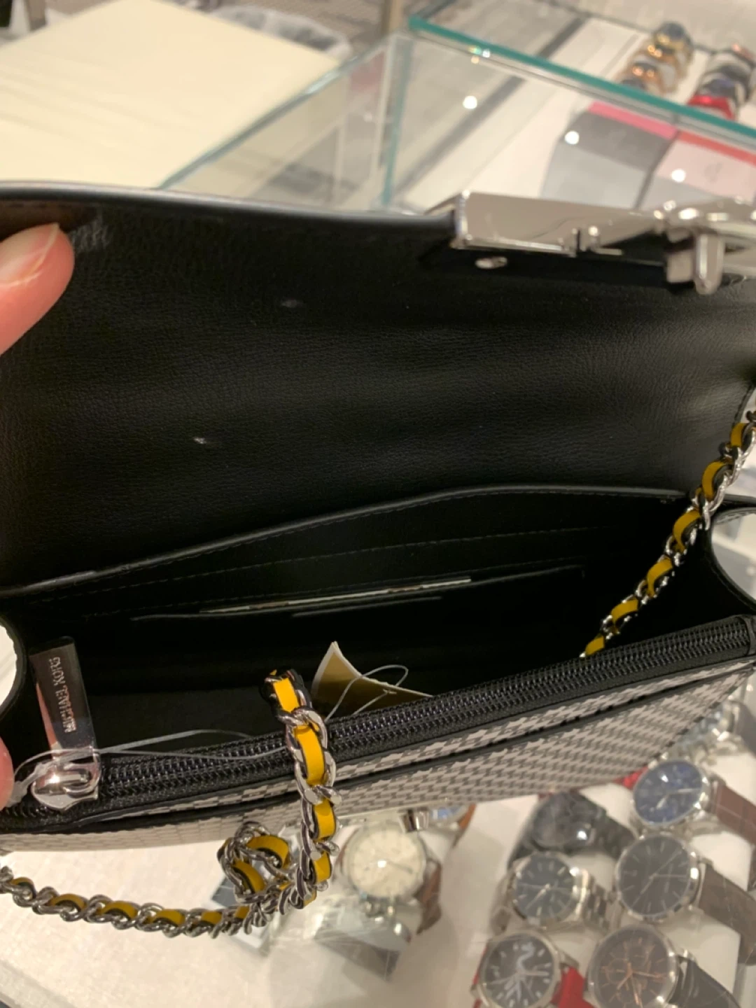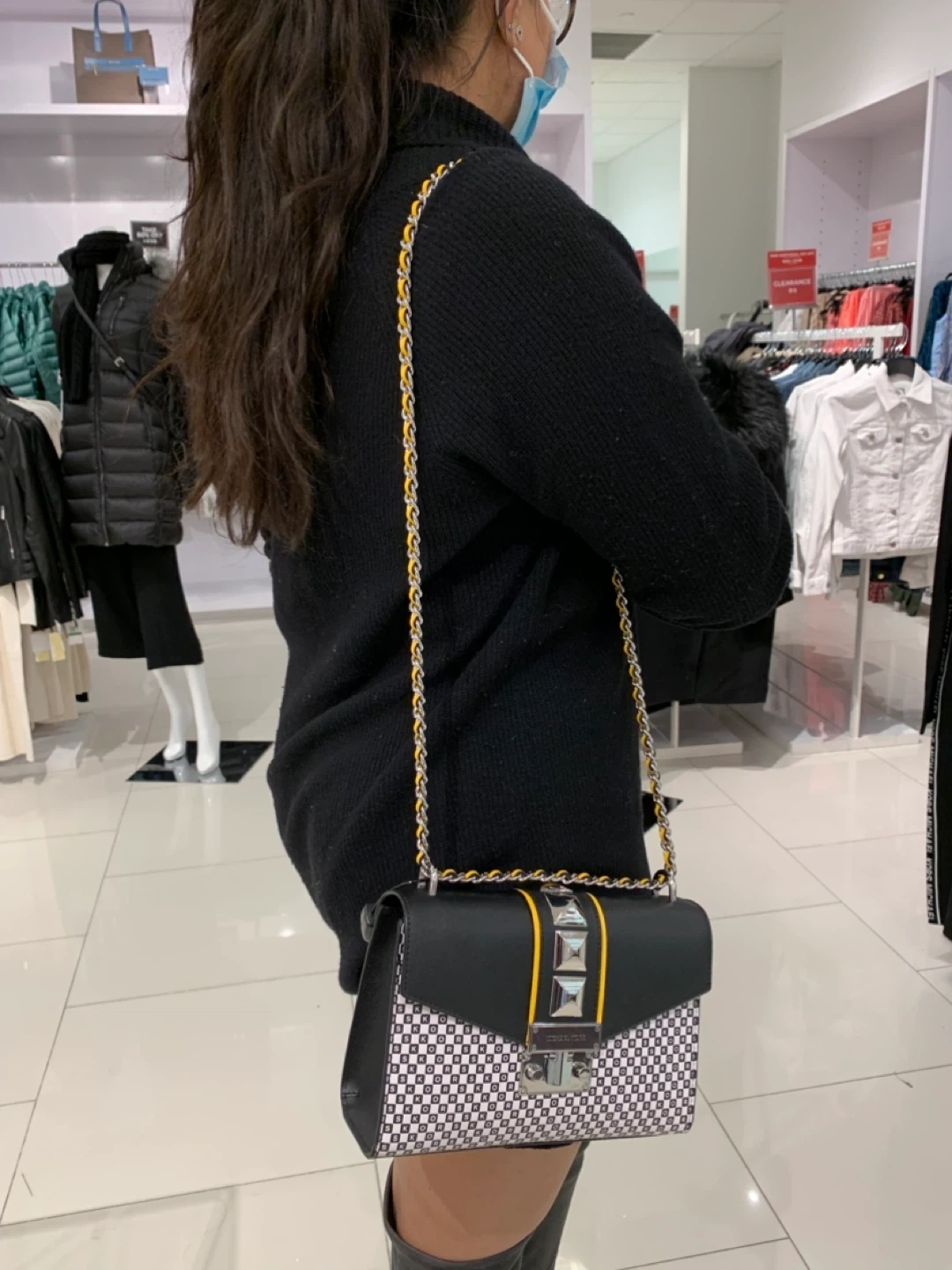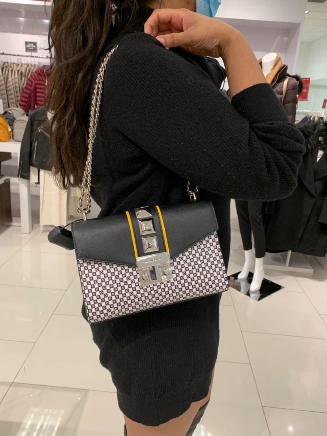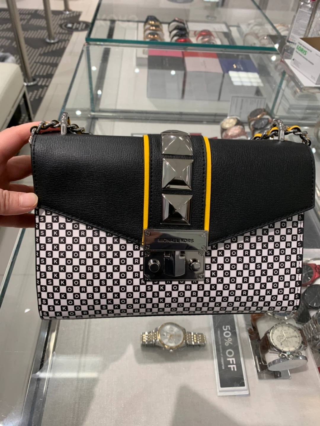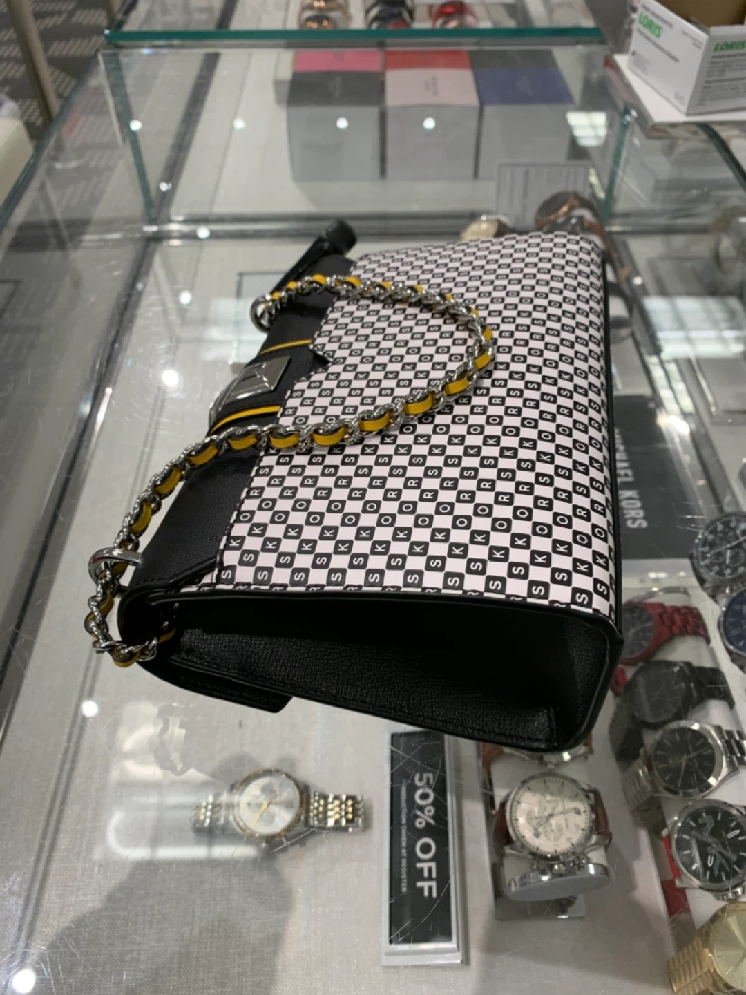 Here's a stylish Michael Kors crossbody bag! It features a black and white checkered pattern with the MK logo, accented with yellow details on the chain strap. The bag is in great condition and ready for a new home
