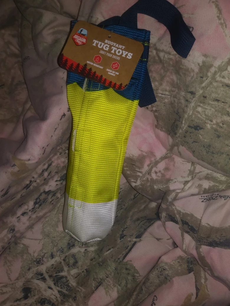 36Selling a brand new Arcadia Trail buoyant tug toy for dogs! This toy is designed to be water-resistant and is perfect for a game of chew or tug with your furry friend. It's a bright yellow and white colour, with a blue handle. Great for dogs who love to play in the water!
