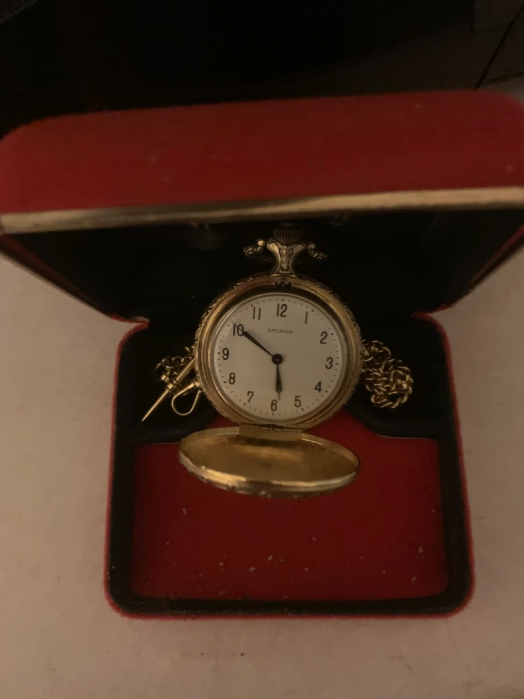60Selling a lovely Arcana pocket watch with a chain! It comes in its original box, perfect for keeping it safe and sound. The watch features a beautiful design on the front and back, and it's in great condition. A unique and timeless piece!