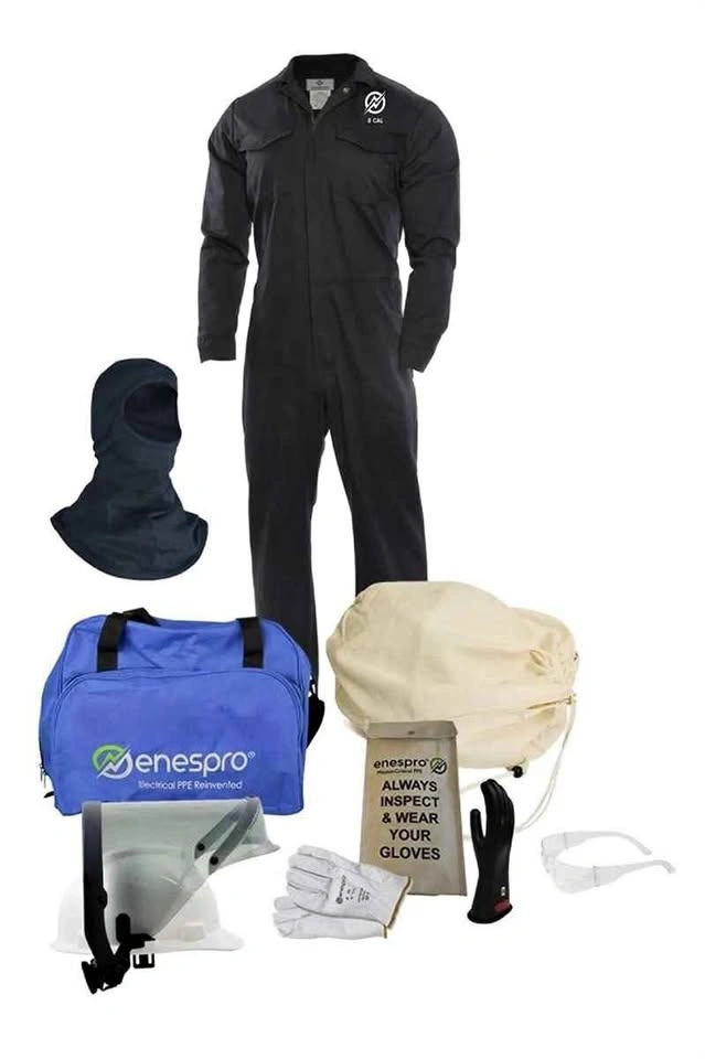 ArcGuard Arc Flash Kit Kit Includes: FR UltraSoft Coverall; Hard Hat with Face shield & Chin Cup; Safety Glasses; Class "0" Voltage Rated Gloves; Leather Glove Protectors Stores in convenient Gear Bag