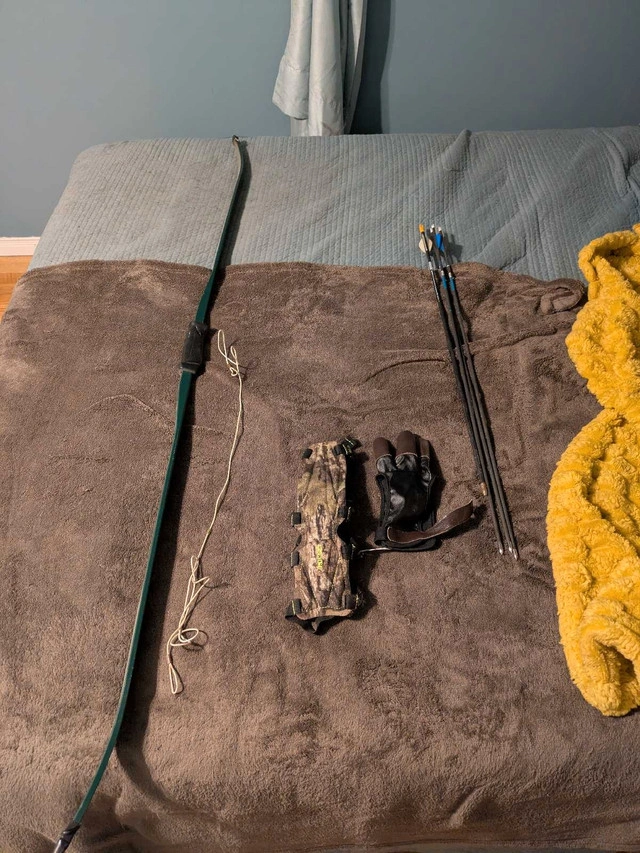 4 arrows that have only been shot a couple times. Glove and arm guard only used once for right hand draw. And a reversible draw bow of about 25/30 lbs bear brand string is old but in good condition. Willing to sell parts or as a set.