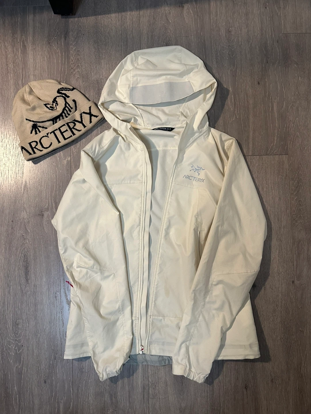 15Selling an Arc'teryx jacket in a women's size medium. It's in great condition and ready for a new home! The jacket is a light, off-white colour and features the Arc'teryx logo. It also includes a beige beanie, let me know for one item