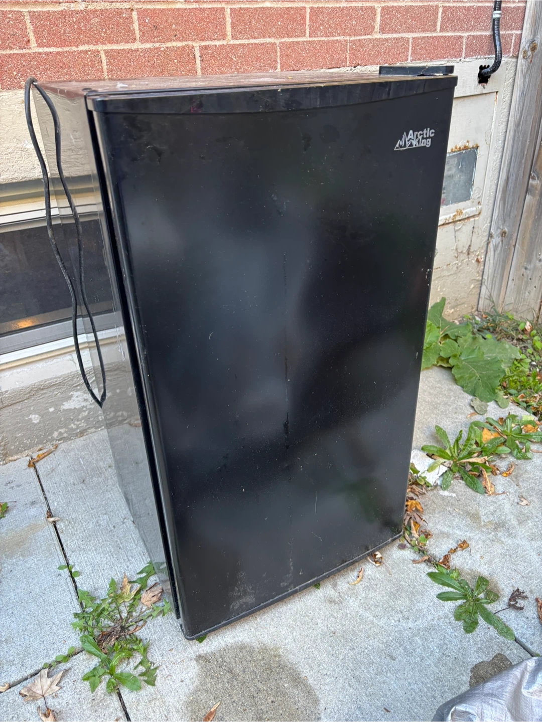 76Selling a used Arctic King mini fridge in black. It's perfect for a dorm room, office, or small apartment. It has some signs of use, but it's in good working condition.