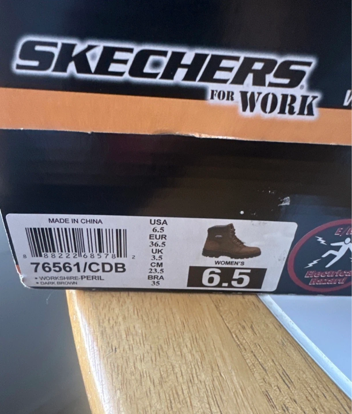 Women's Skechers steel toe work boots in dark brown. Features memory foam insoles and slip-resistant outsoles. Electrical hazard protection. Leather and man-made upper.