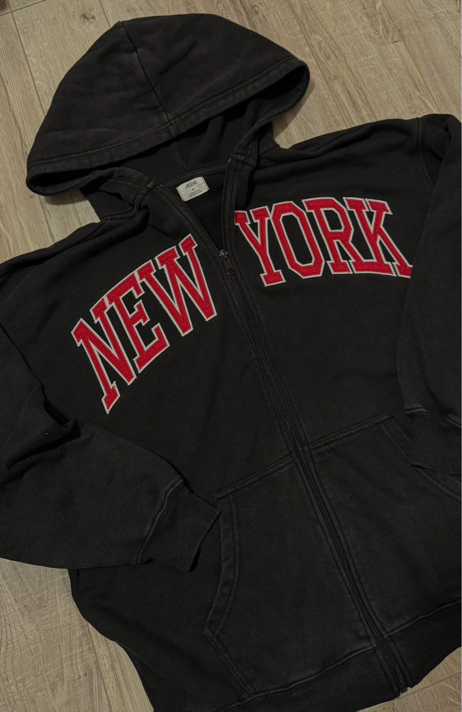 80Selling a black zip-up hoodie from Ardene! It has "New York" written in red and white lettering across the front. It's a size medium and in great condition. Perfect for layering or just lounging around!