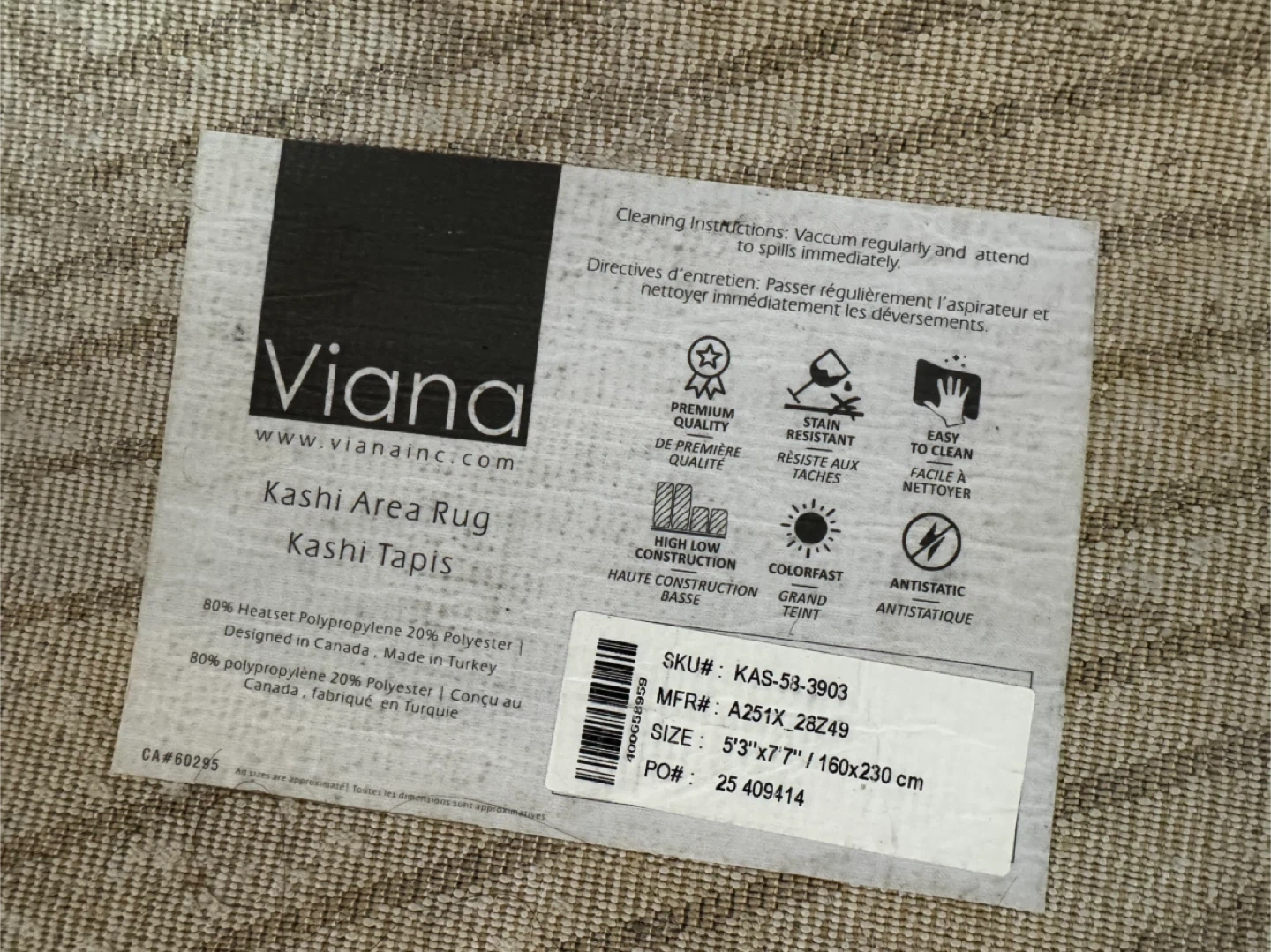 Selling a Viana Kashi area rug in excellent condition! It's a stylish addition to any room. - Size: 5'3"x7'7" (160x230 cm) - Material: 80% Heatset Polypropylene, 20% Polyester - Stain resistant and easy to clean - Made in Turkey $55 Yonge and finch area