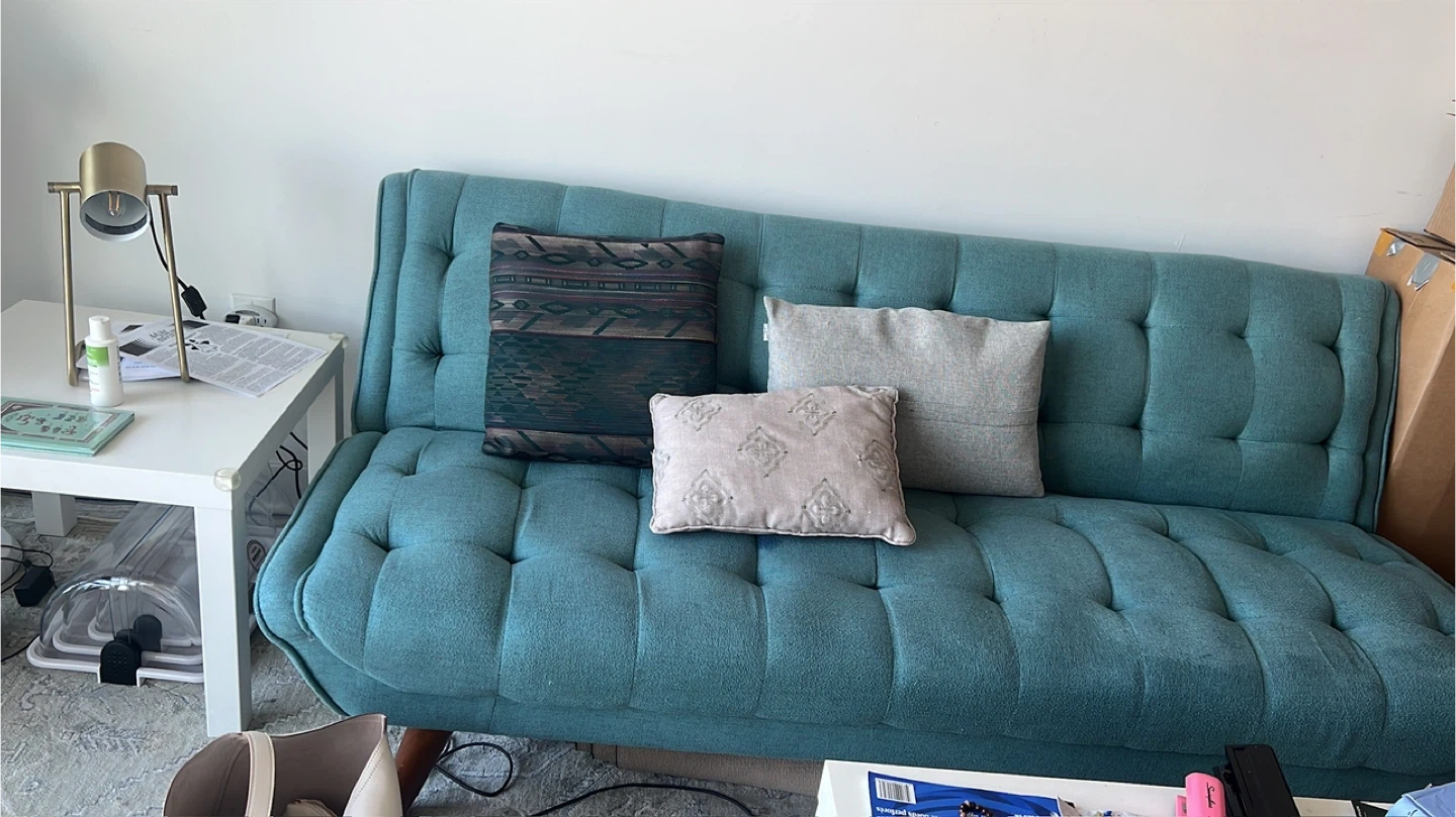 Selling a nice area rug and a teal-coloured sofa. Both are in good condition and would look great in any living room! The rug has a subtle pattern and the sofa has a tufted design. Perfect for adding a touch of style to your home