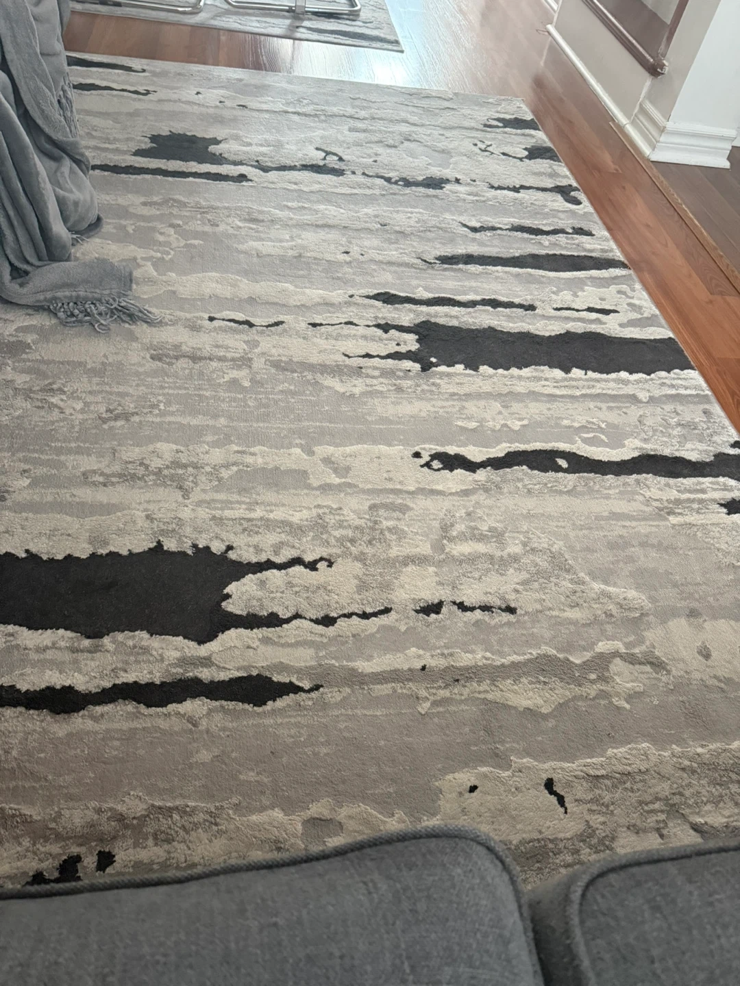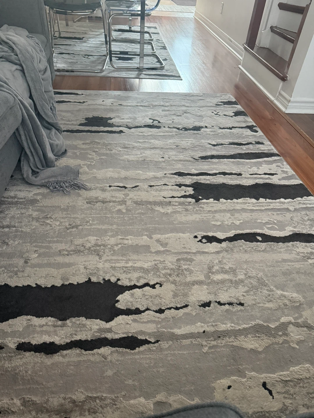 Selling a gently used area rug with a modern design in grey and black. It's in great shape and would look lovely in any living room or bedroom. The rug is made of a soft material, making it comfortable to walk on. It's a great addition to any home looking for a stylish touch!