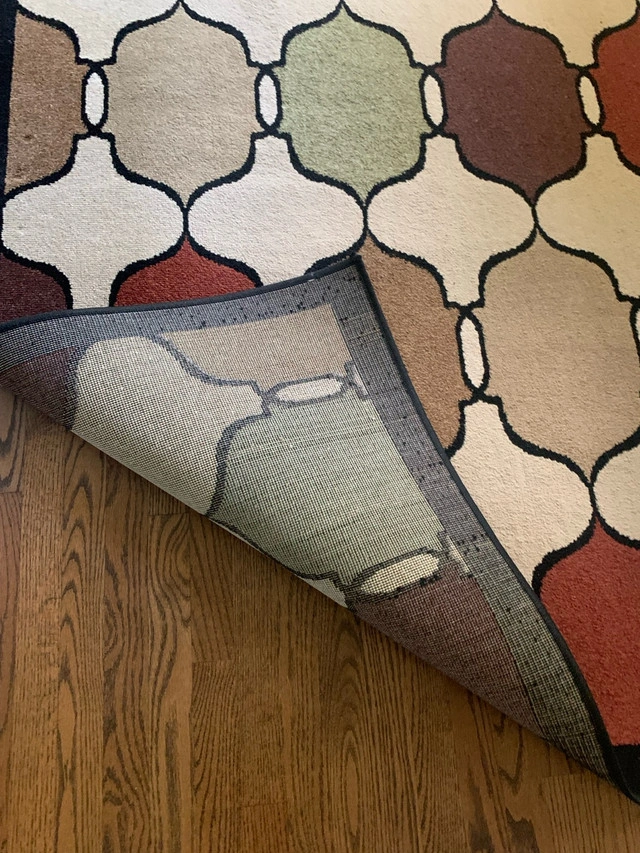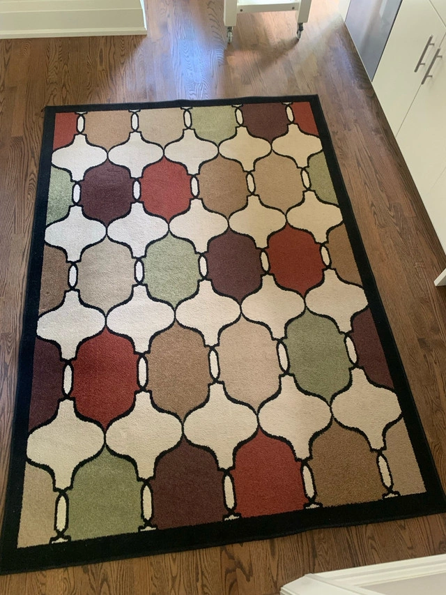 Add a touch of elegance to your home with this stylish area rug, showcasing a contemporary geometric pattern and rich, warm tones. This rug measures 62” X 90” making it a versatile addition to any room. It's in good condition, ready to enhance your living space. Additional details include: * Size: Approximately 5x7 feet * Pattern: Contemporary geometric design * Colour Palette: Warm tones Spruce up your floors with this beauty – it's more than just a rug; it's a conversation starter! Don't miss out on this chance to add a dash of charm to your home. If the ad's up, it's still up for grabs!