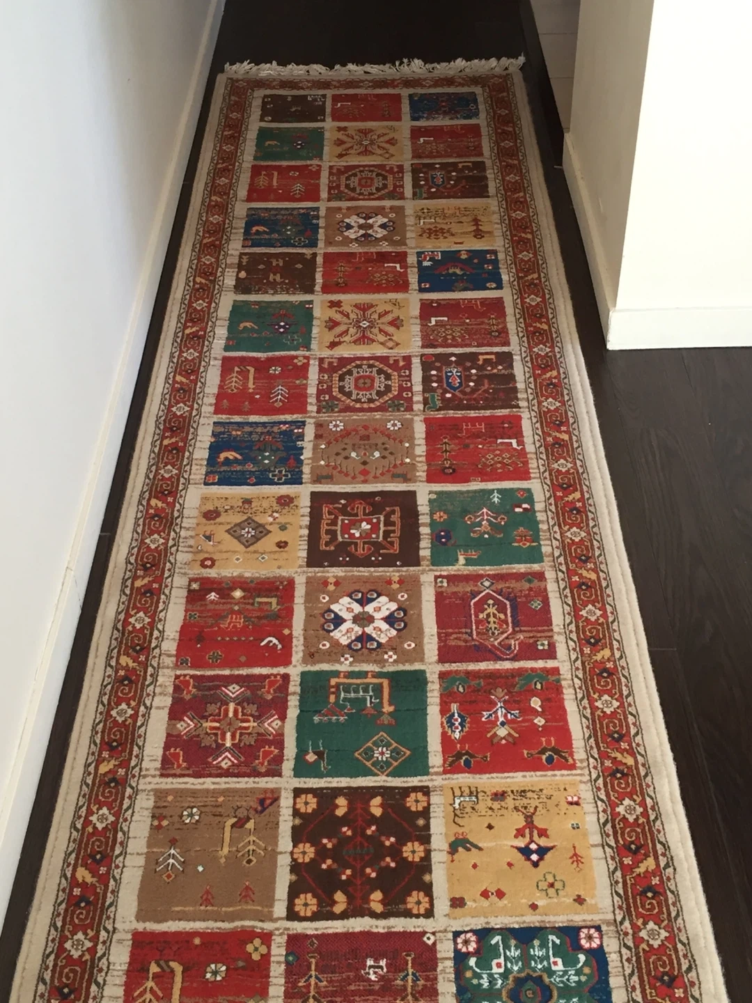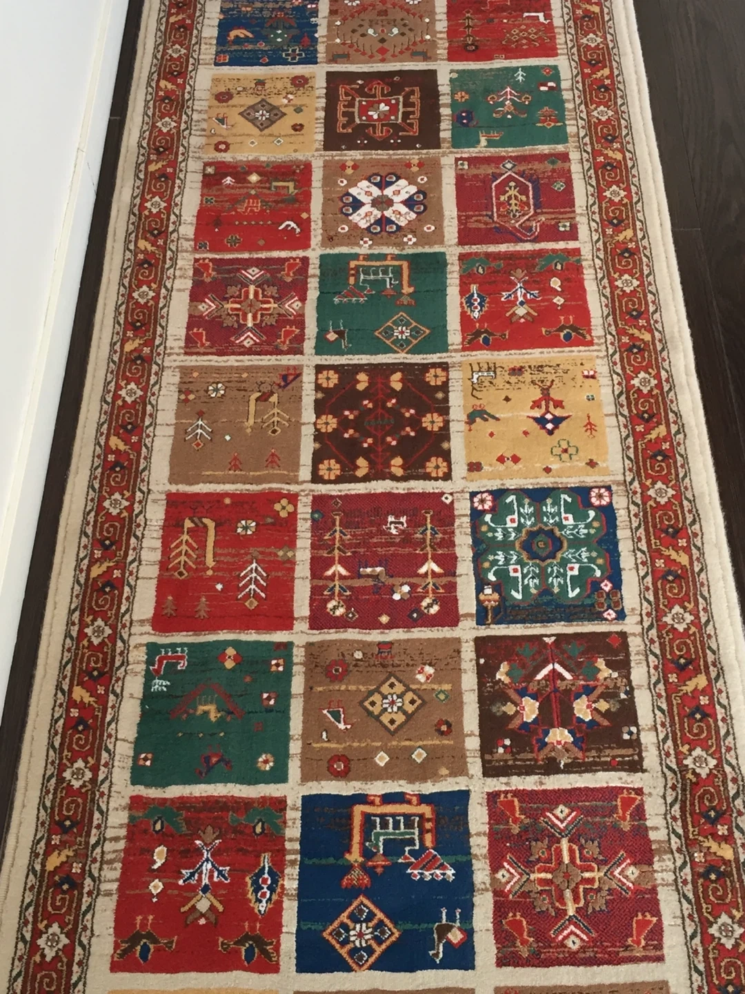 10This is an area rug runner. It has a colourful design with square patterns. The rug is in good condition and would be a great addition to any home