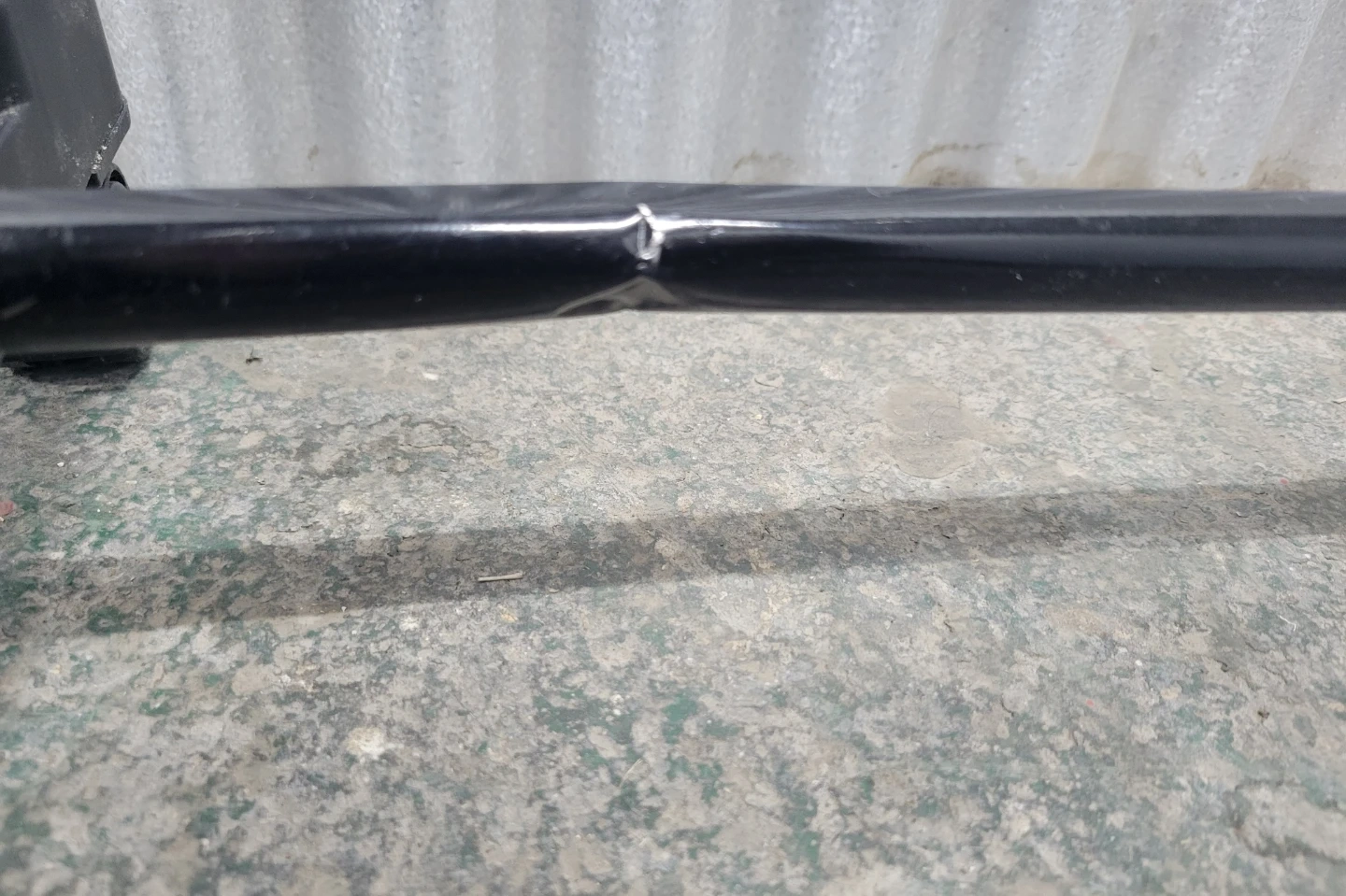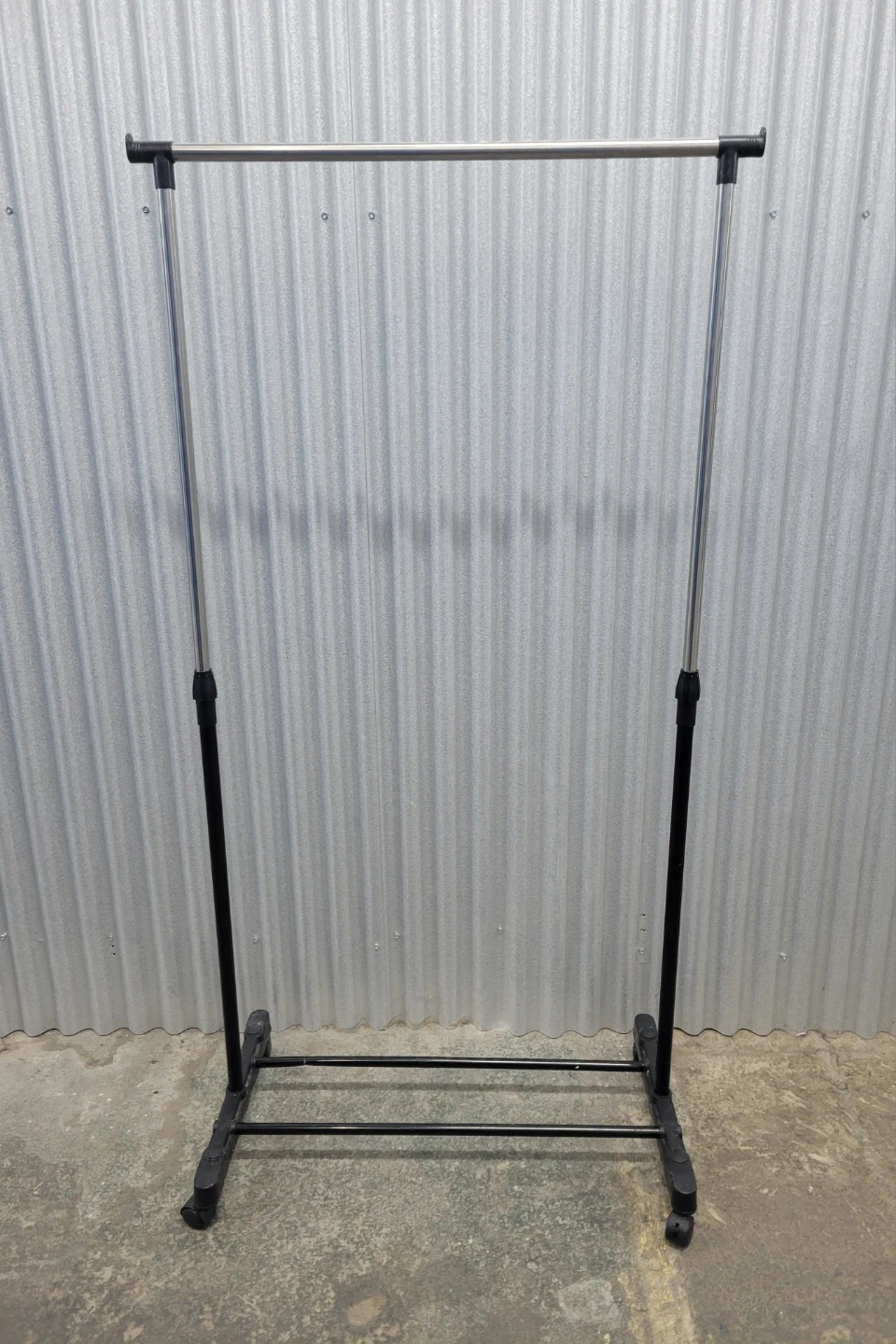 This is a portable garment rack with a metal hanging bar and a black base. It features wheels for easy mobility. The rack is collapsible for storage. Some minor scuffs on the metal bar are visible.