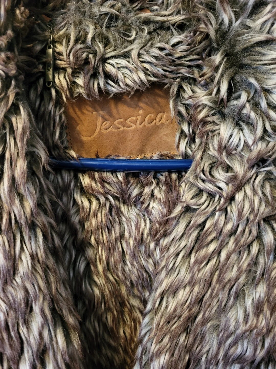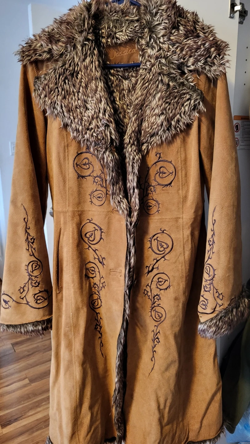 A stylish Jessica London coat made from soft suede. It features intricate floral embroidery down the front and on the sleeves. The collar, cuffs, and front opening are lined with cosy faux fur trim. This coat offers a unique bohemian flair and is perfect for cooler weather.