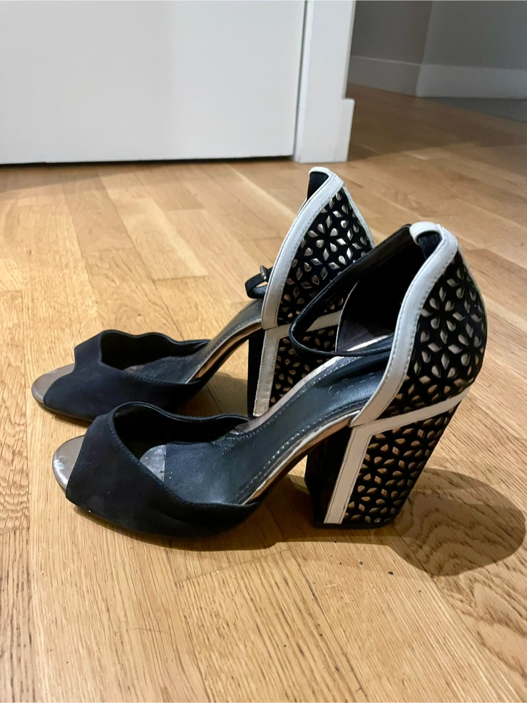 10Cute pair of Arezzo heels in black and silver! They are a size 9 and have a stylish design. Perfect for dressing up or a night out