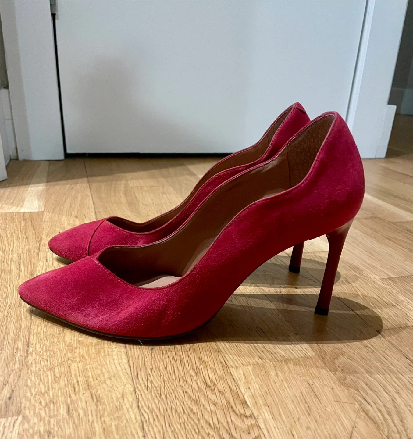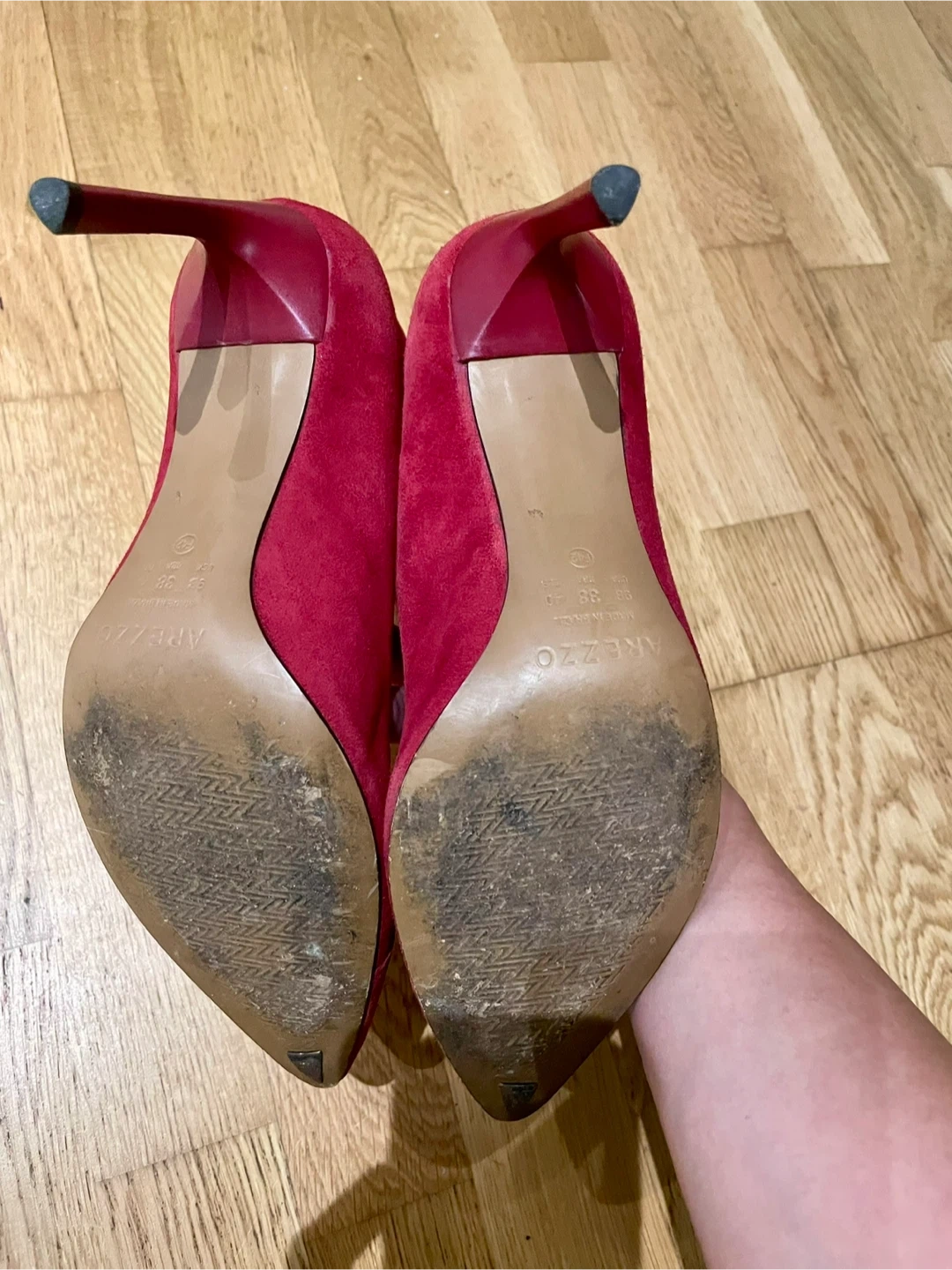 10Selling a pair of Arezzo heels in a vibrant red suede! They're a Brazilian size 38, which is about a size 9 in Canada. These heels are perfect for adding a pop of colour to any outfit. They have some signs of wear on the soles, but the suede is in good condition!