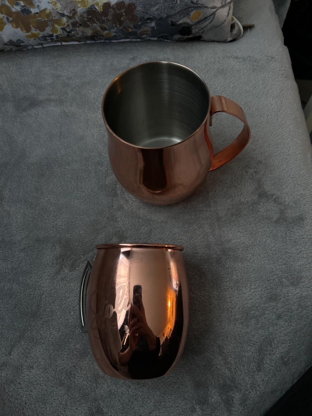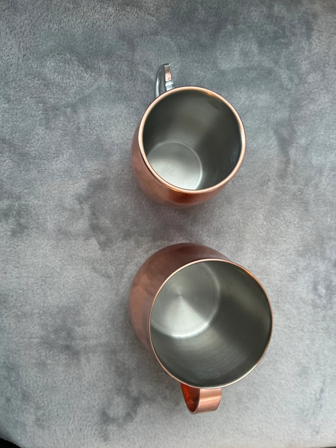 Two shiny copper mugs, perfect for enjoying your favourite beverages. These mugs have a sleek, modern design with a metallic copper finish. They're great for serving Moscow Mules or other chilled drinks! The small one has a scratch
