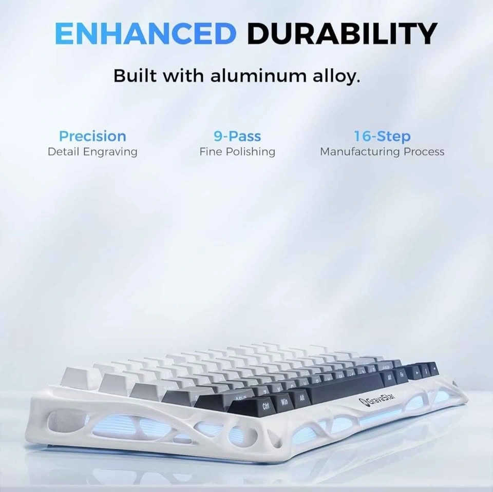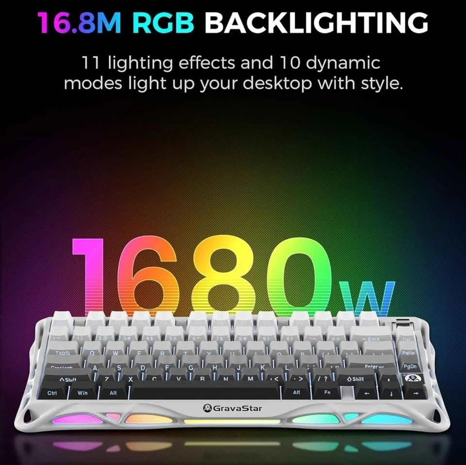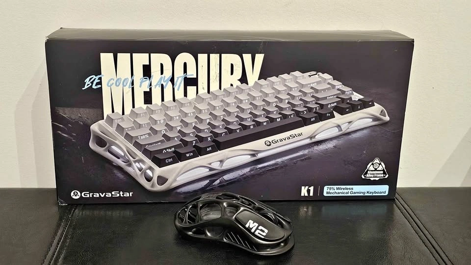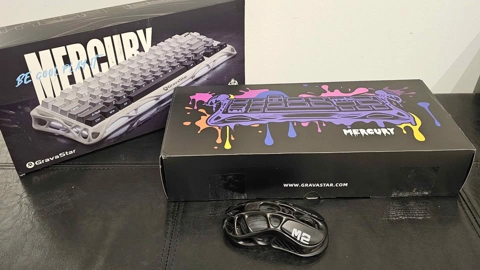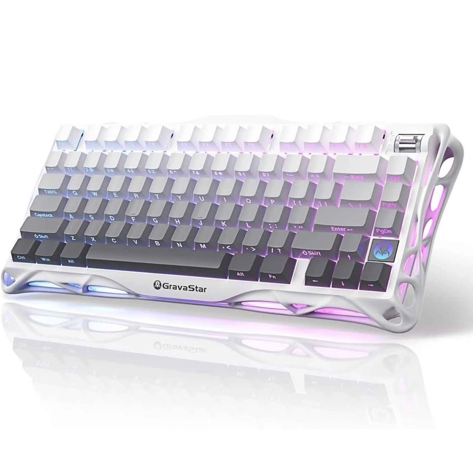 Mechanical gaming keyboard with a unique white hollow-carved aluminum alloy frame and RGB lighting. This 75% layout wireless model comes with the original box, cleaning cloth, and spare switches. Set includes a matching black GravaStar Mercury M2 wireless gaming mouse with a similar skeletonized design. Mouse is new.