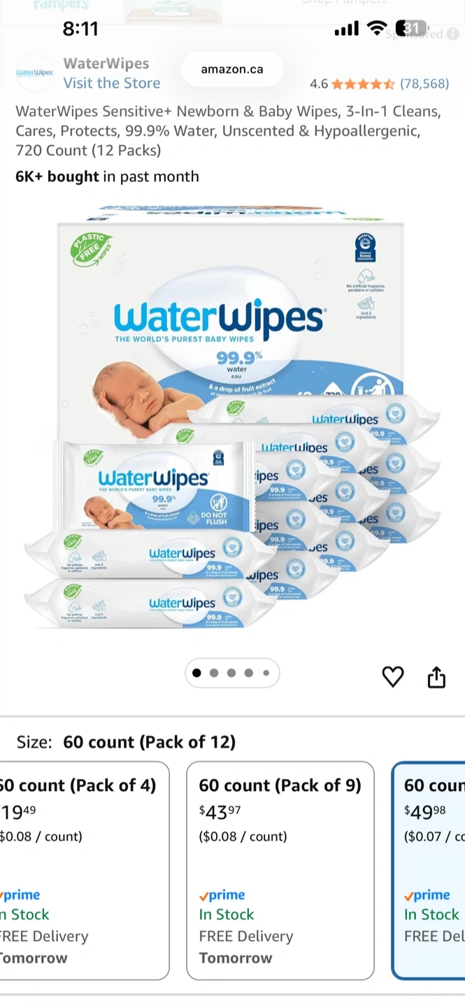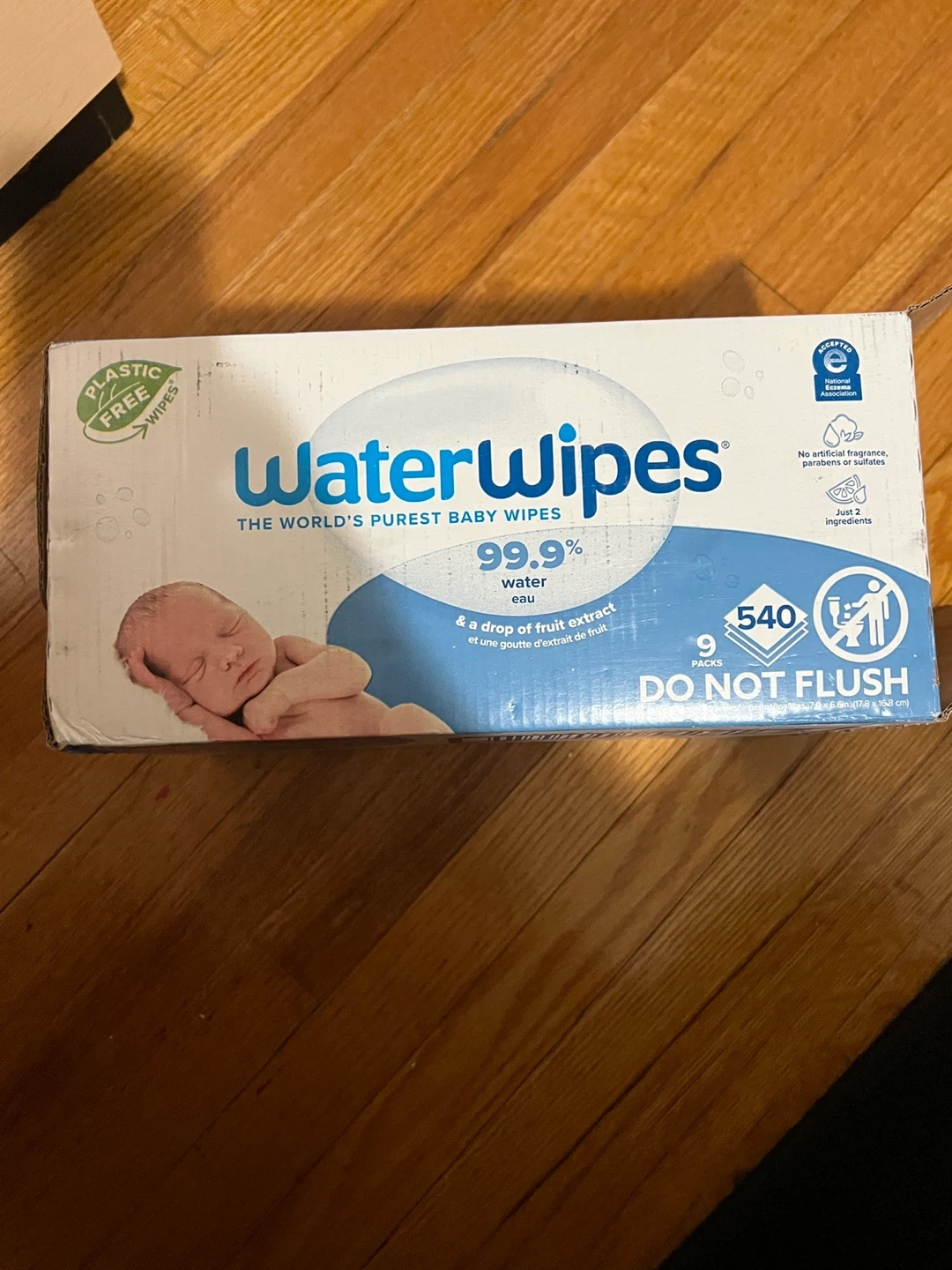 WaterWipes baby wipes are made with 99.9% water and a drop of fruit extract. They're plastic-free and hypoallergenic. This pack includes 9 individual packs, with 540 wipes total. They expire 10/26.