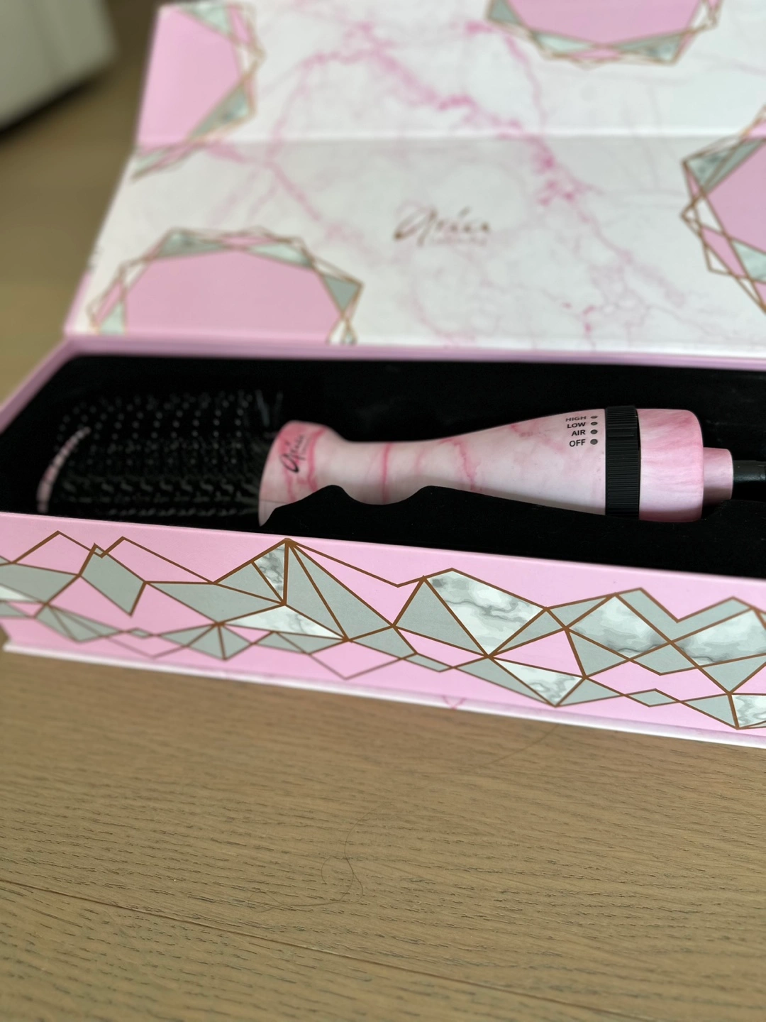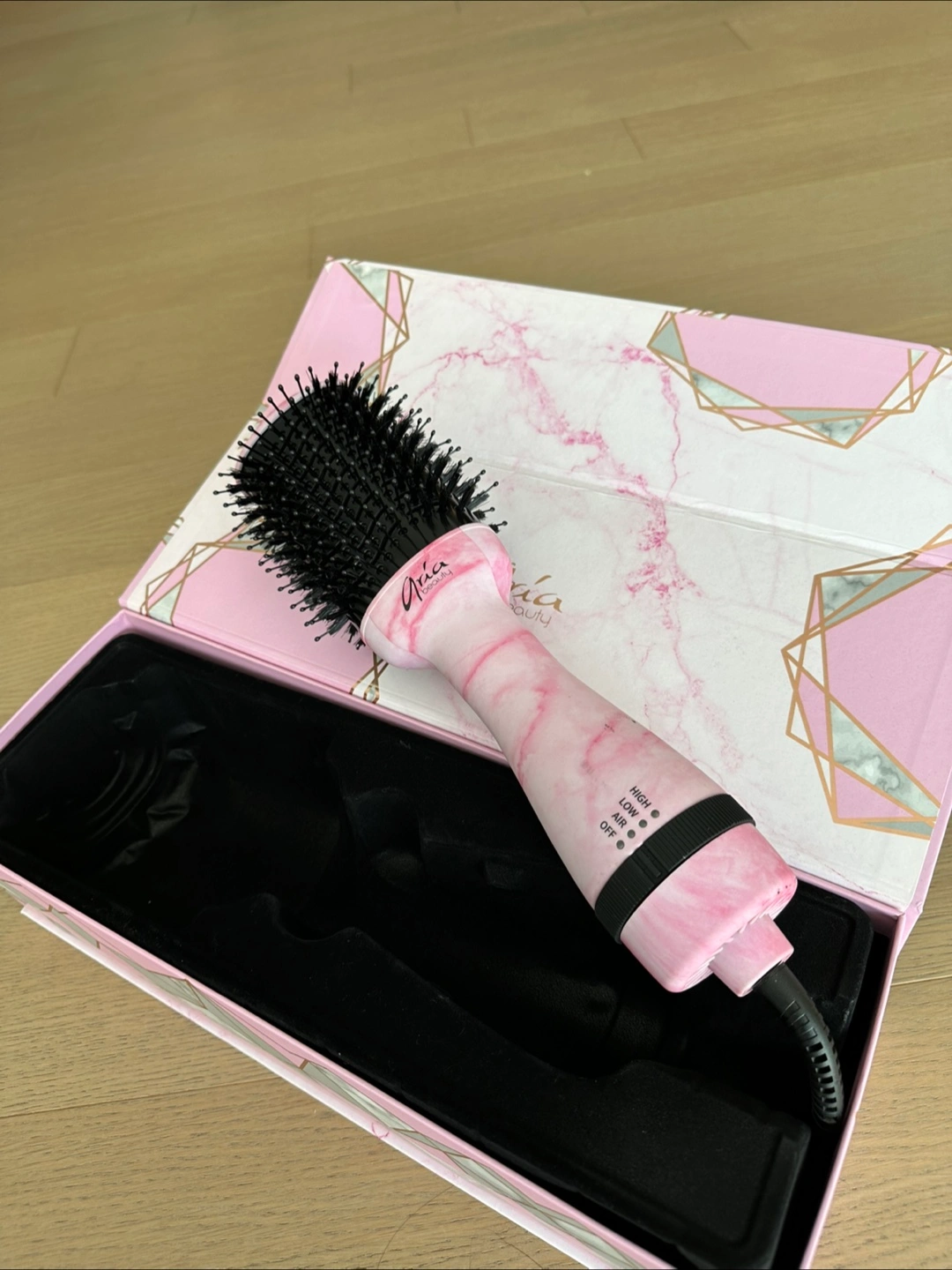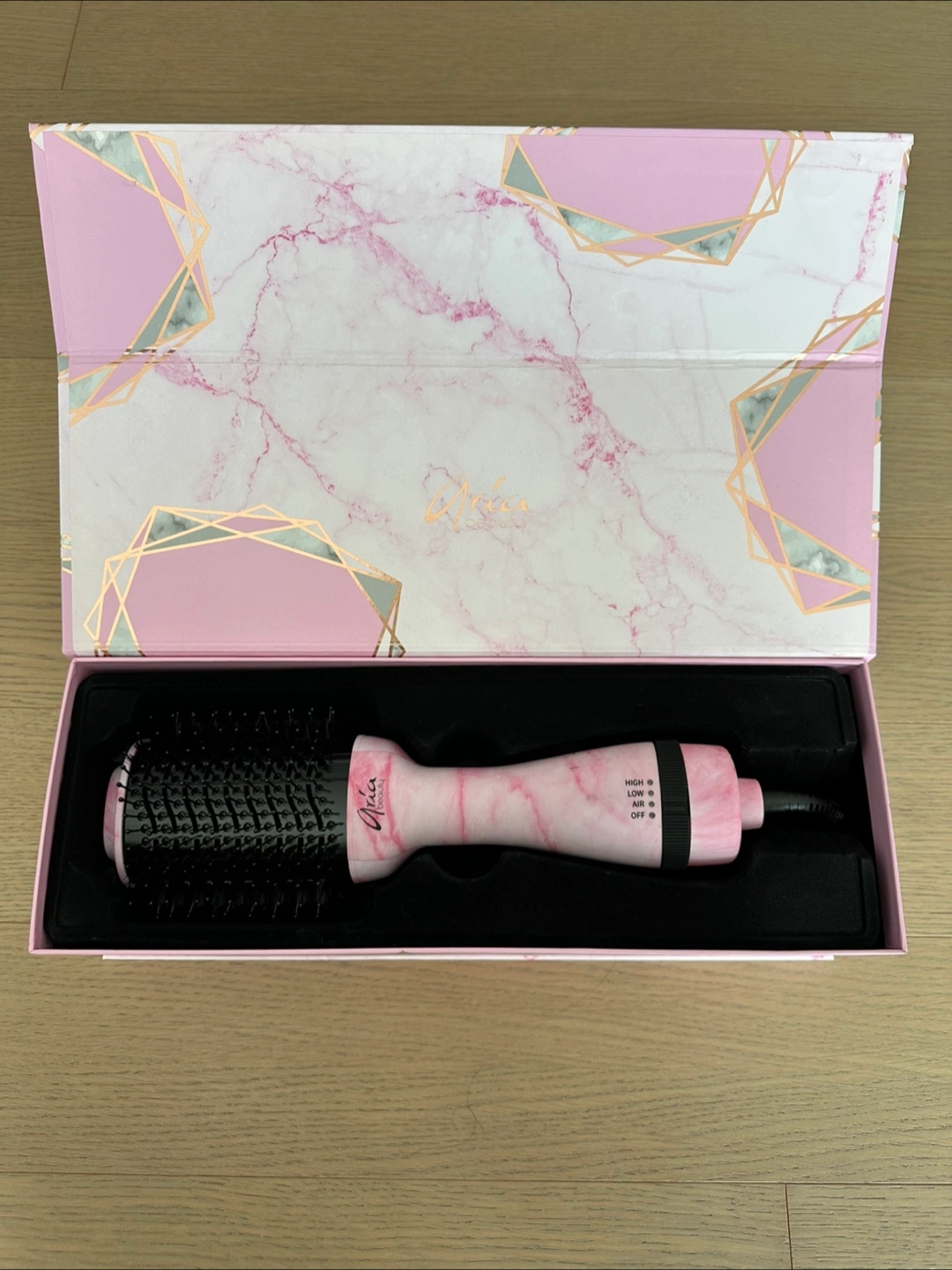 Selling an Aria Beauty hot brush blow dryer in a stylish pink marble design! It's in great condition, unused and comes with the original box. Perfect for creating smooth, voluminous hairstyles at home. It has settings for high, low, and off, and a cool air setting too.