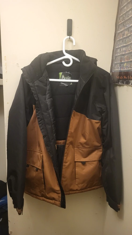 10Here's a great jacket from Arie! It's a size medium and features a stylish black and brown colour block design. Perfect for staying warm and looking good!