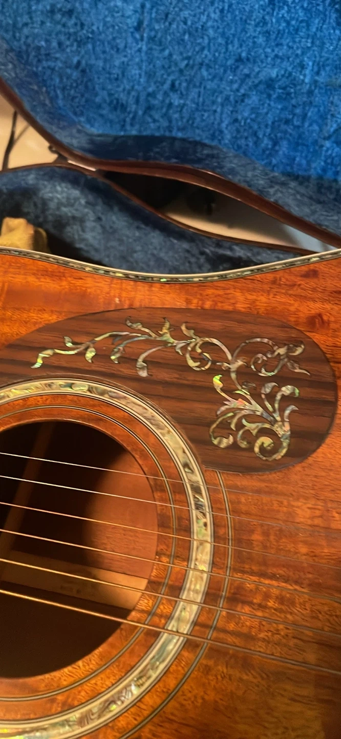 Acoustic guitar with beautiful inlay work on the fretboard and body. It's in a hard case and looks like it's made of mahogany. The headstock says Martin but it is NOT a Martin. Plays and sounds great but it is NOT a genuine Martin. Has a pickup in it as well. Great to play but also a great as a display piece. In great condition!
