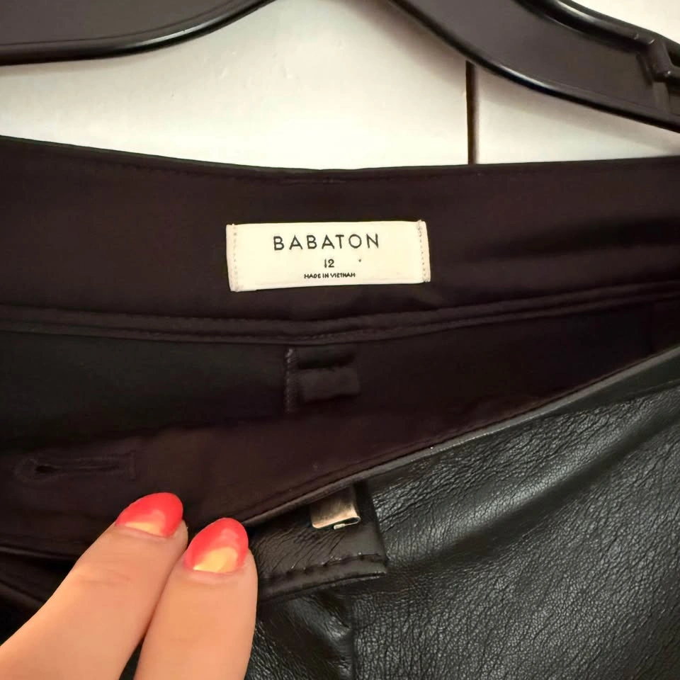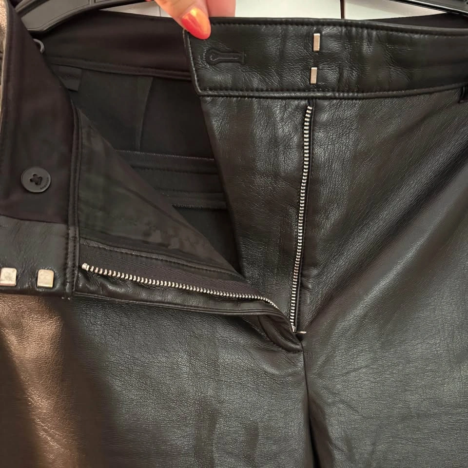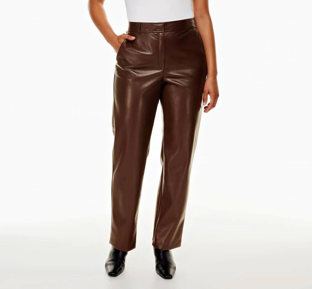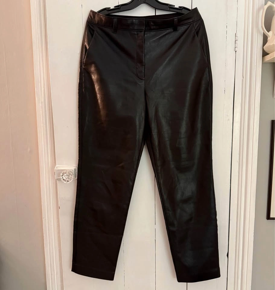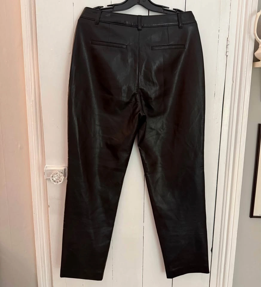 15Black color Size 12 Like new condition Pick up in Bowmanville These are mid-rise trousers with slash hand pockets, back welt pockets and a darted back waist for shaping. They’re made with our innovative Vegan Leather that looks and feels like the real thing. Rise: Mid Leg: Straight Length: Full — Intended to hit at the ground while wearing flat shoes Inseam: Size 4 is 30" — Inseam varies by size Height: Regular — Designed for heights around 5'3" to 5'7" Model is 5'9"/175.25cm wearing a size 12, Regular On average, customers say it fits true to size