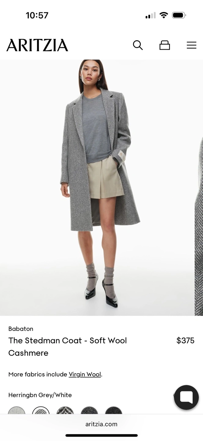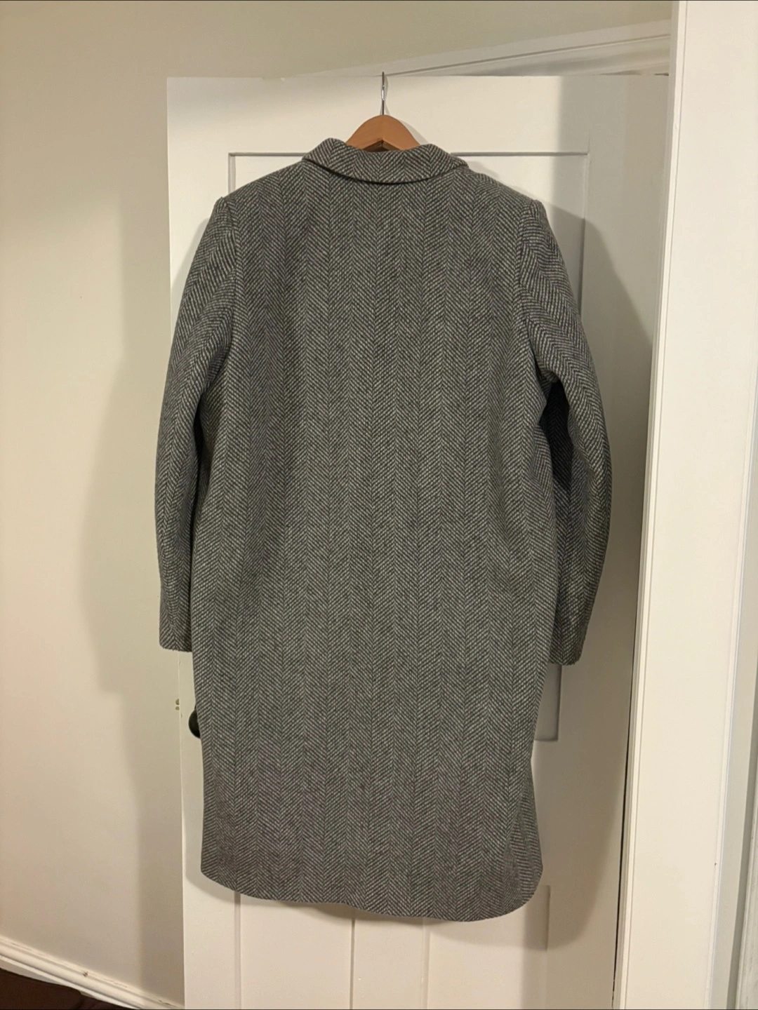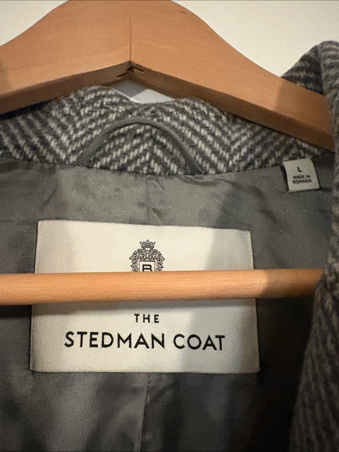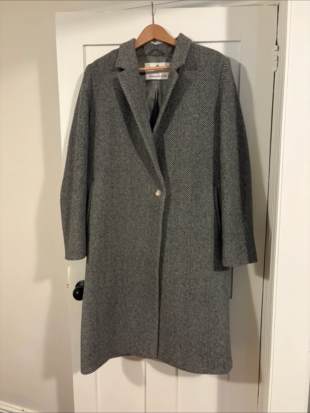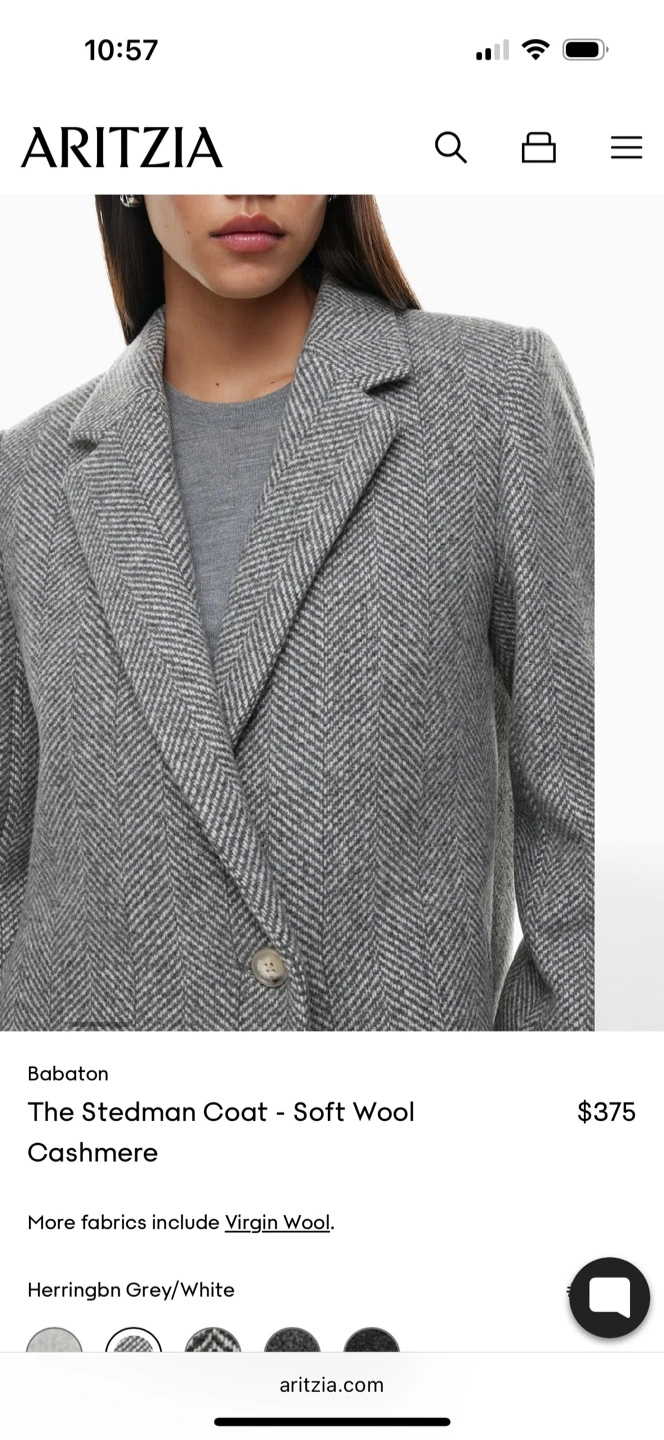 10Selling an Aritzia Babaton Stedman Coat in a lovely herringbone grey/white pattern. It's a size L and made with soft wool cashmere. The original price was $375! It also includes virgin wool.