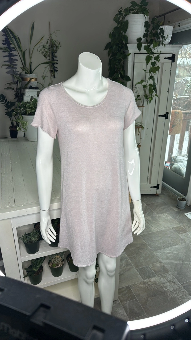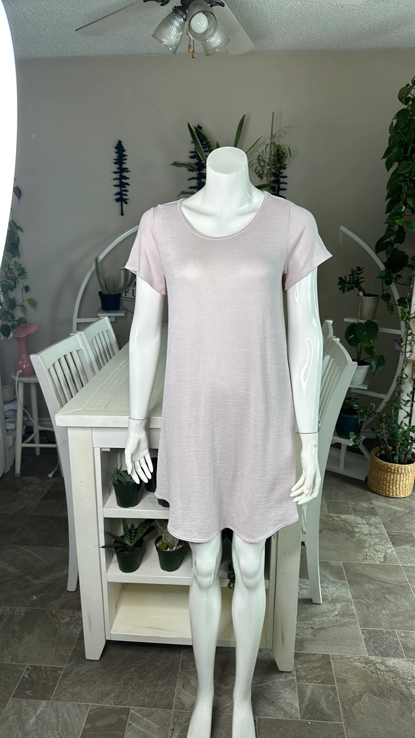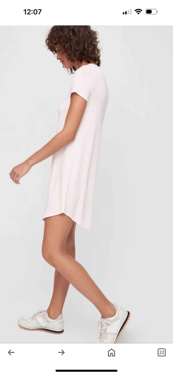 10Short-sleeved, pink, t-shirt dress. Size XS. This is a t-shirt dress with a slightly flared silhouette. It's made from Reposa™ — a luxe jersey knit that hangs beautifully and skims the body Size Med