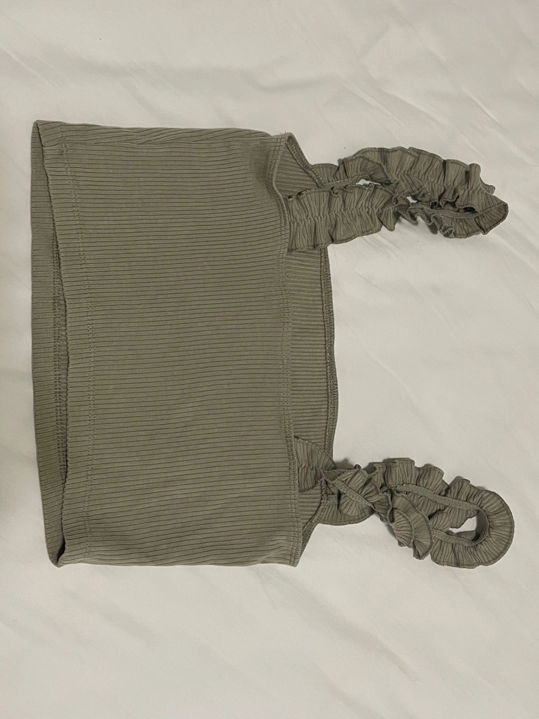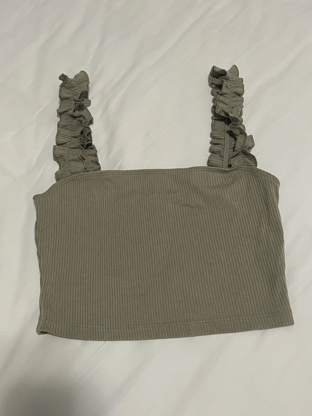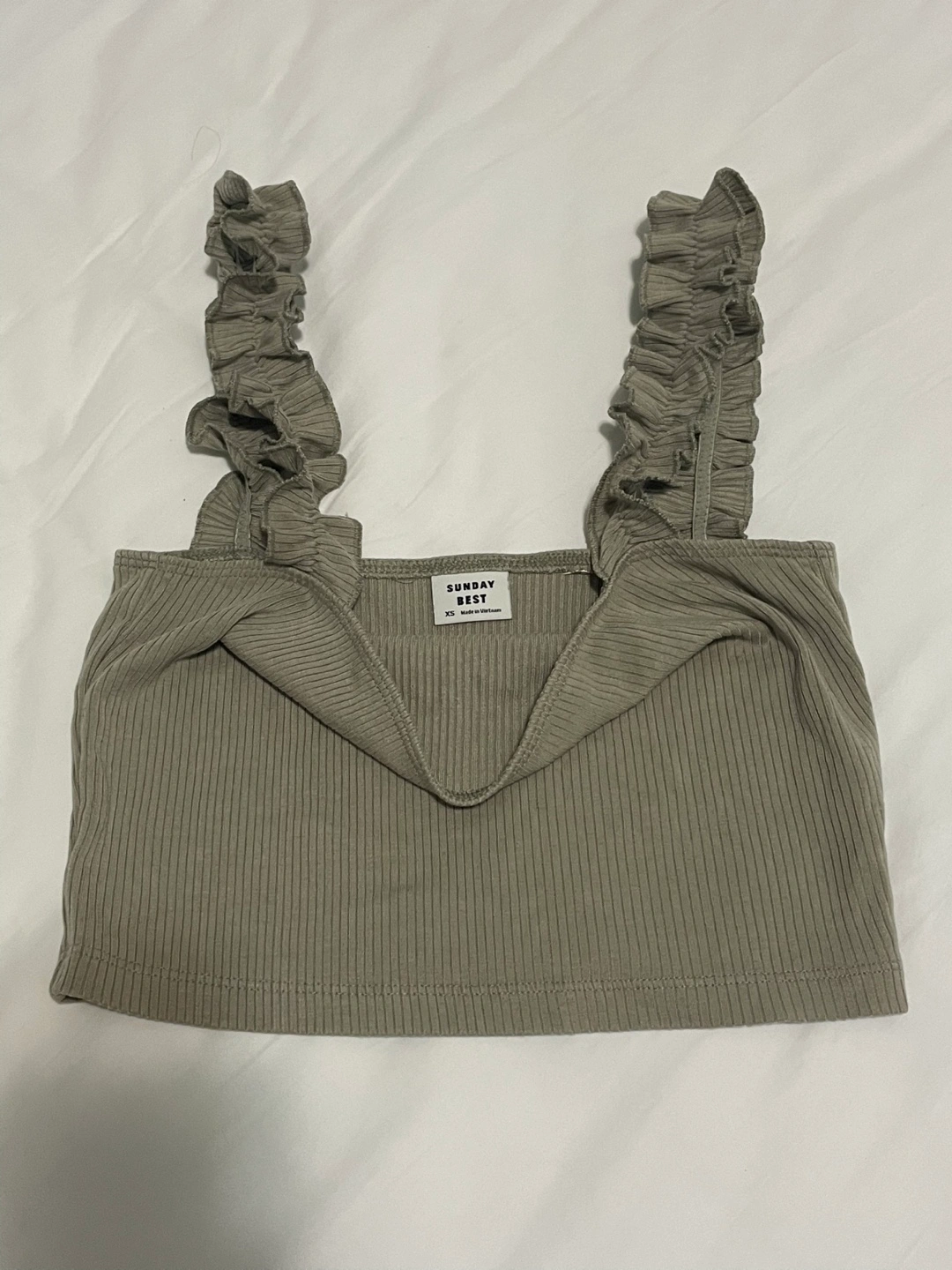 Here's a cute Sunday Best tank top, perfect for summer! It's a size XS and features adorable ruffle detailing on the straps. The colour is a versatile neutral, and the ribbed material is super comfy. It's in great condition and ready for a new home!