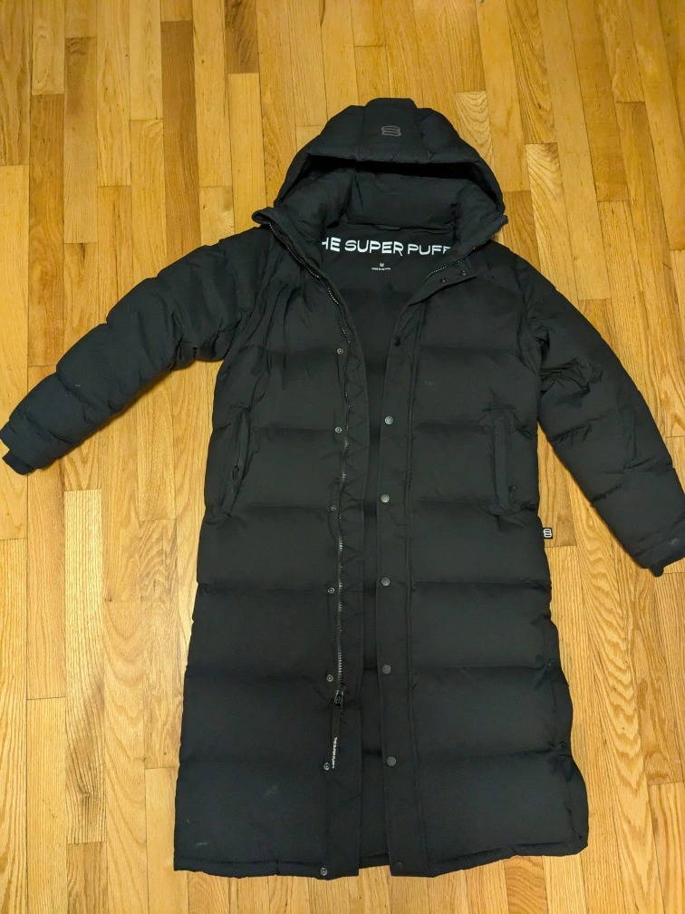 10Black long puffer jacket with a hood. Size M. purchased last year. only worn a few times