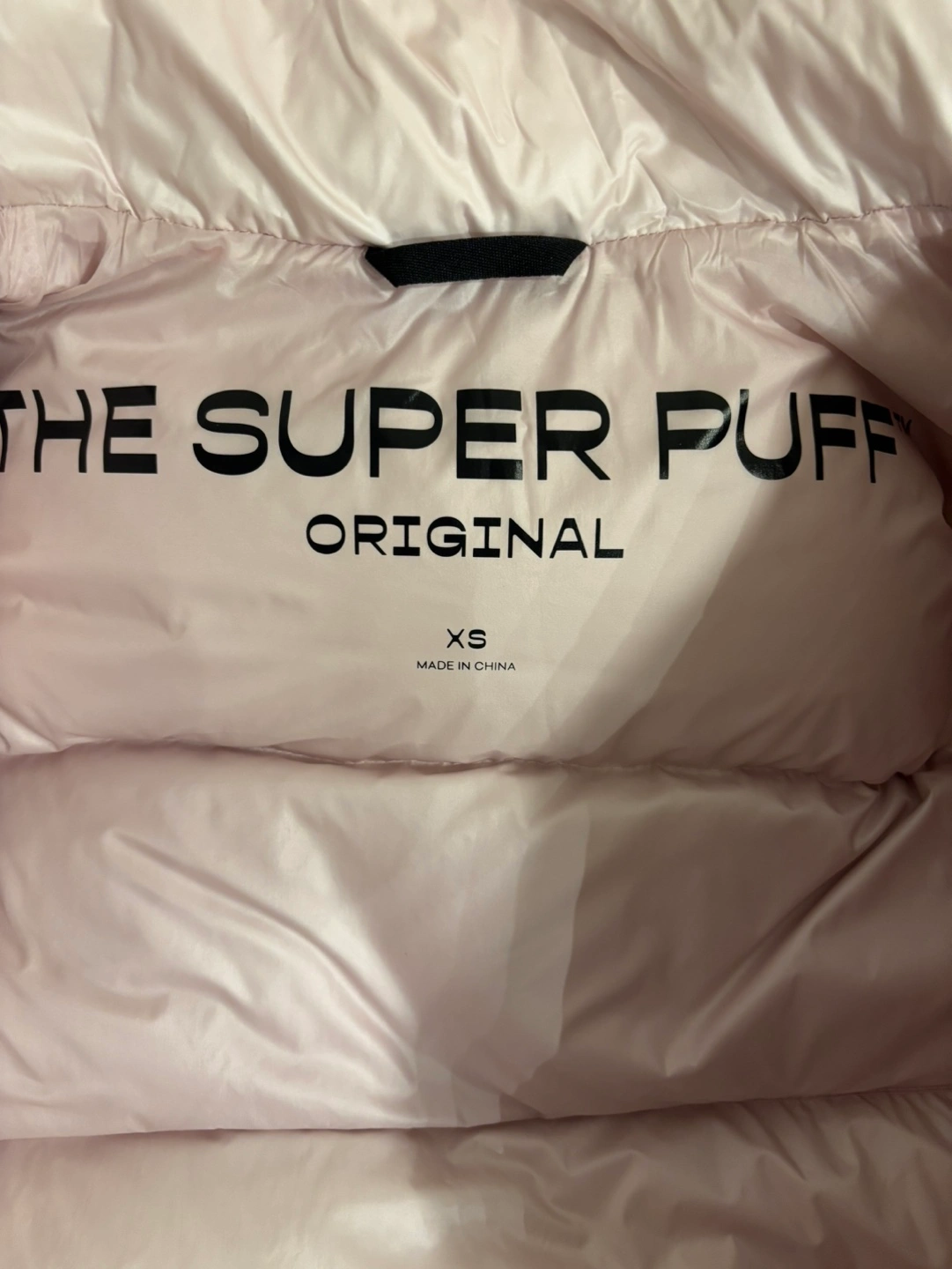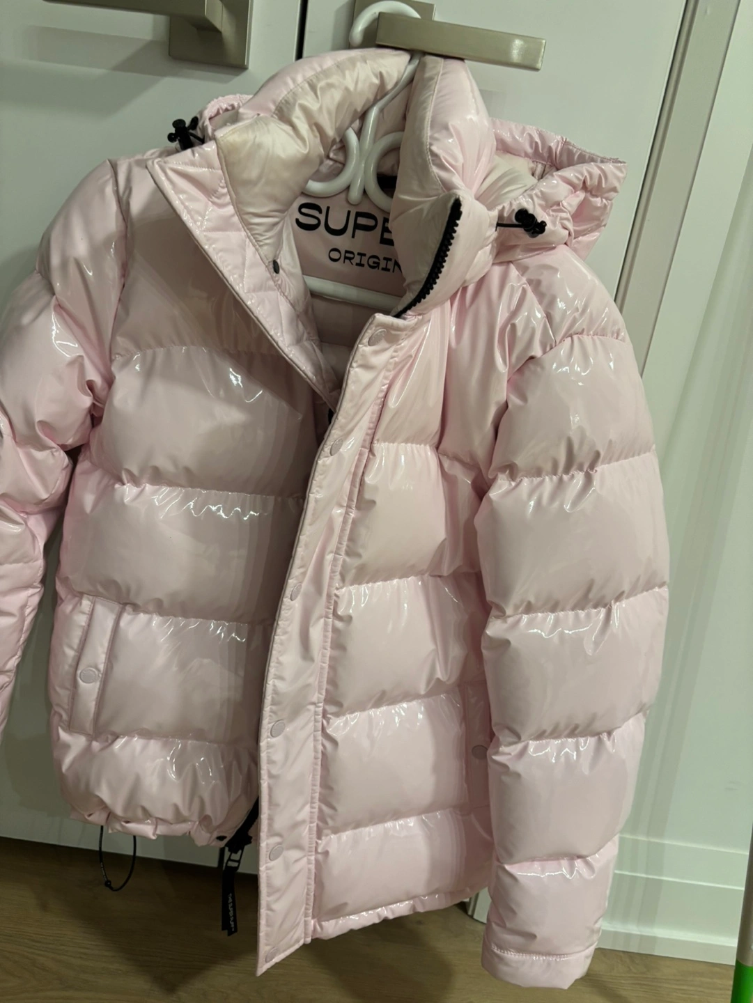 331Shiny pink puffer jacket. Size XS. Has small mark on one side under sleeve, pale and not visible unless you lift your arm. Comes with hood. Limited Edition Cherry Blossom color, more vibrant in real life.
