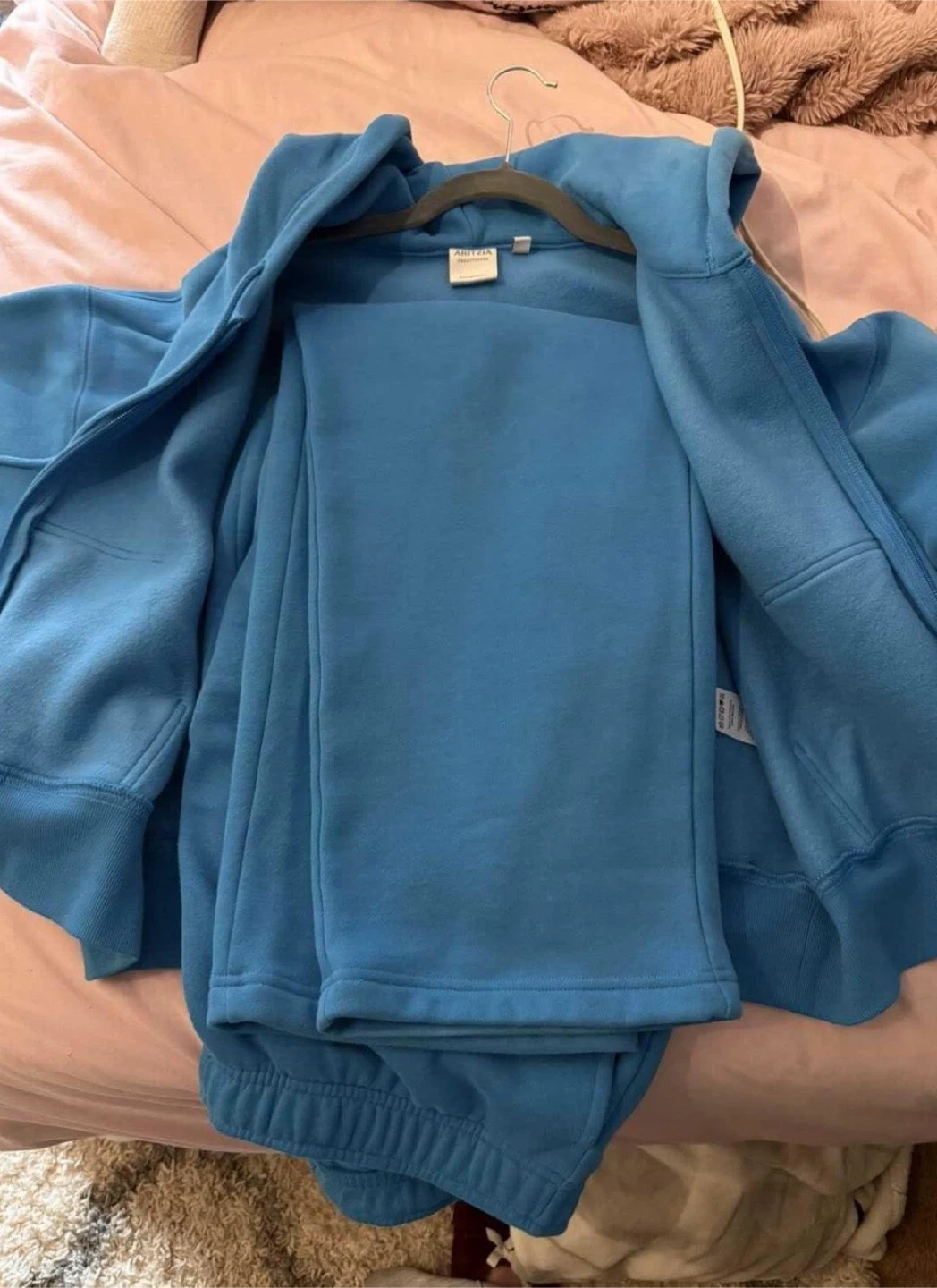 76Selling an Aritzia Sweatfleece set, including a zip-up hoodie and matching pants! The set is a beautiful light blue colour and is in great condition. The hoodie is a crop boyfriend fit and bottoms are mega fleece sweatpants. The sweater is a sis medium and bottoms are a large. Perfect for lounging or running errands! NO OFFERS WILL BE ACCEPTED ITS ALREADY PRICED VERY CHEAP!
