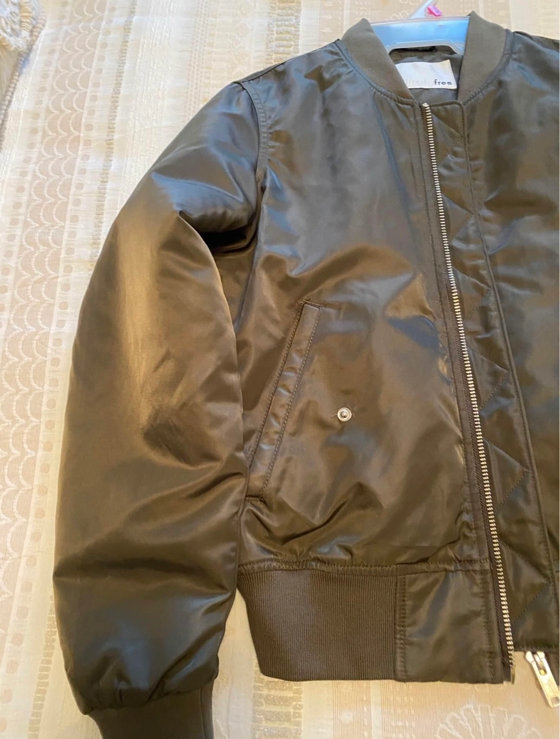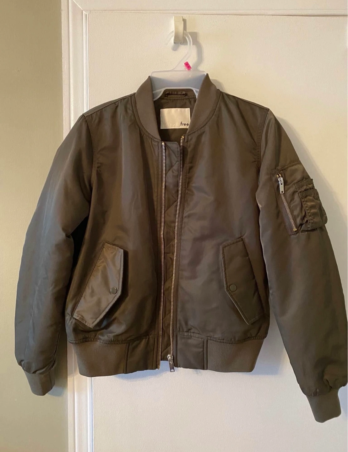 58Green bomber jacket. Size small. Zipper closure. Two pockets on the front. One pocket on the sleeve.