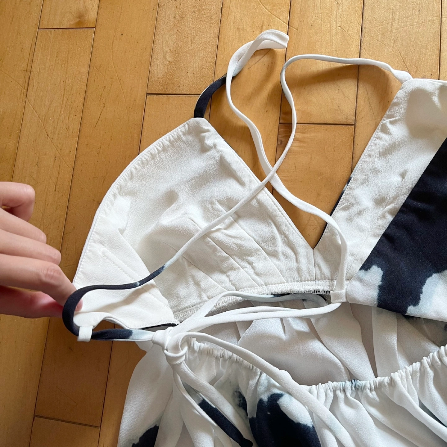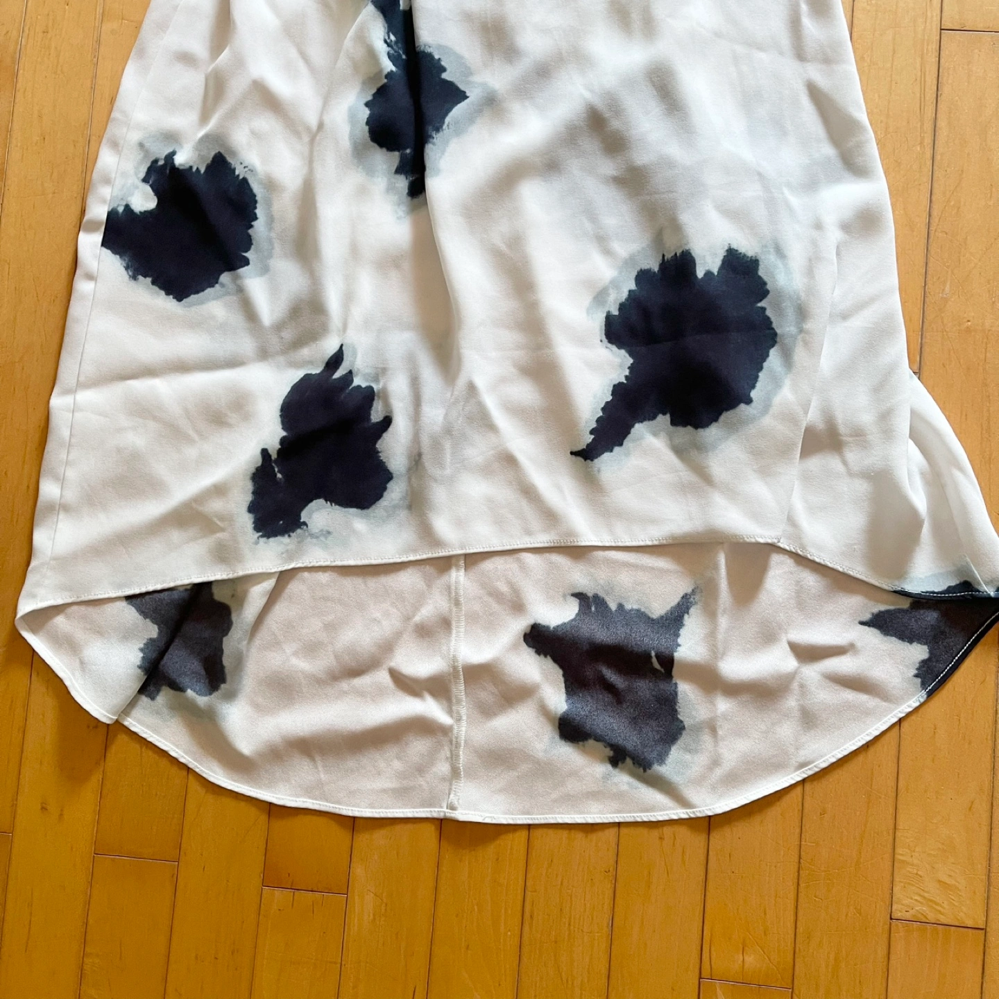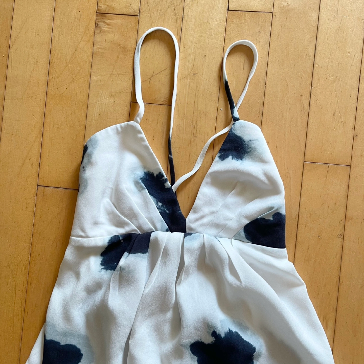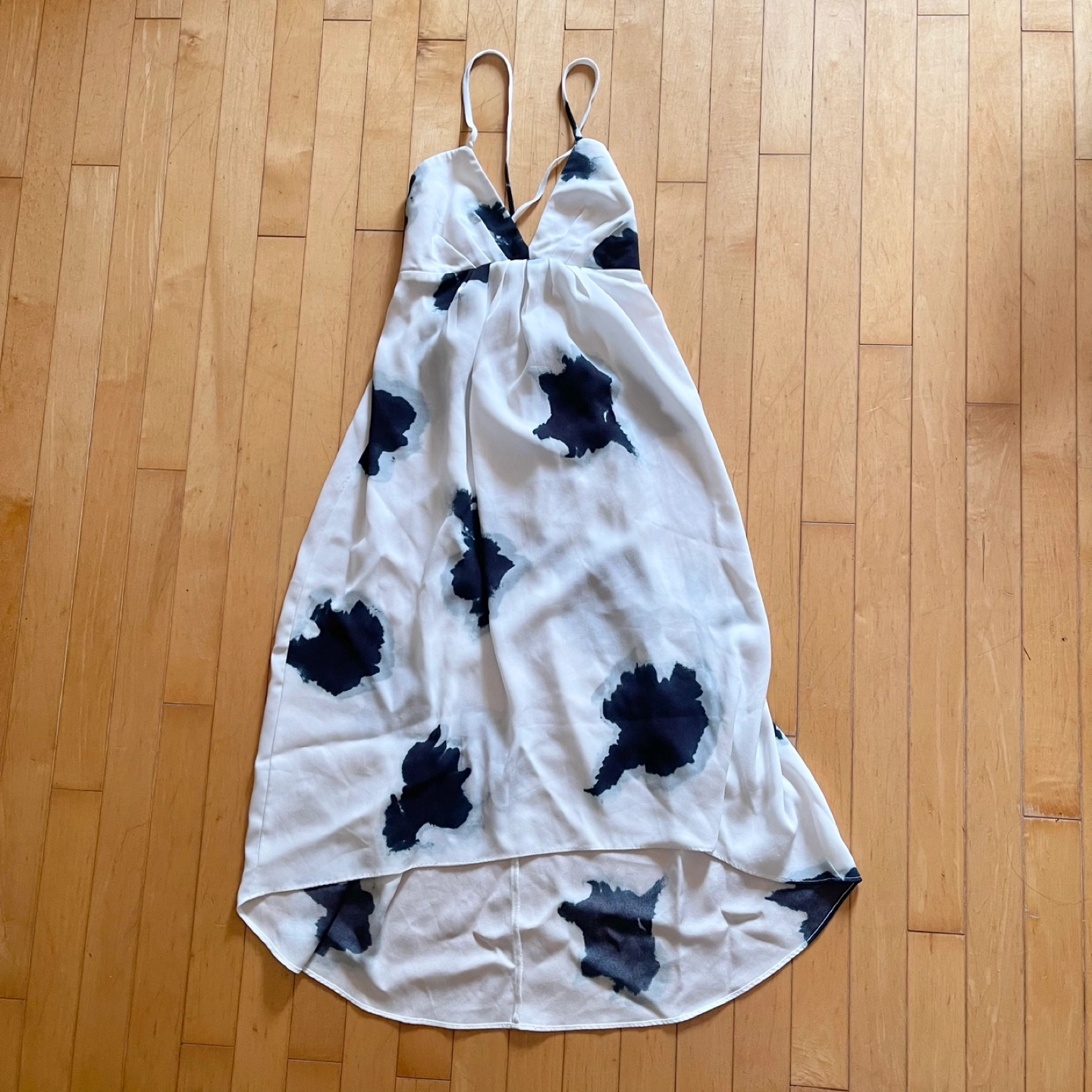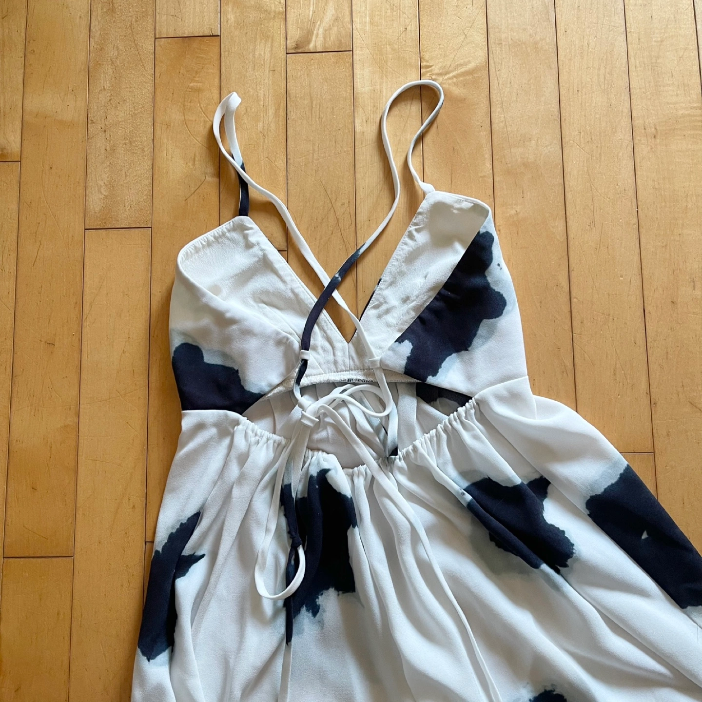 62Stunning high-low dress. Features a V-neckline, spaghetti straps, and a unique tie-back detail. Made from a lightweight material, perfect for summer. Features an abstract print. Size 00 (stretchy!) can fit XS or S