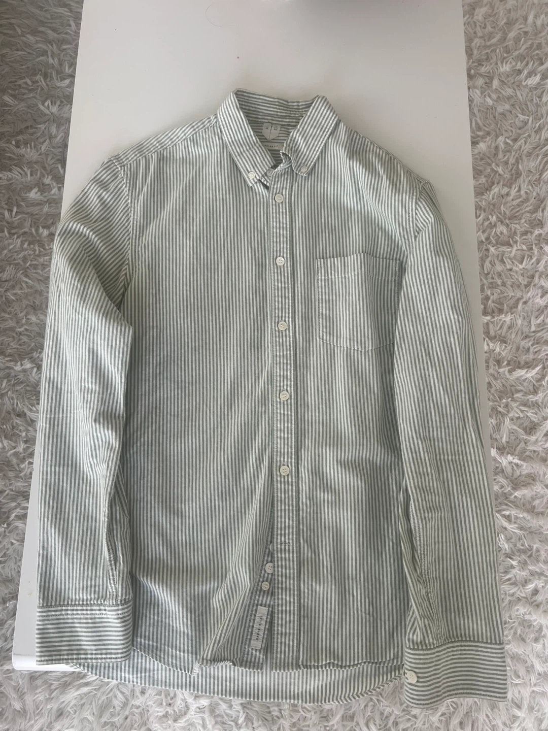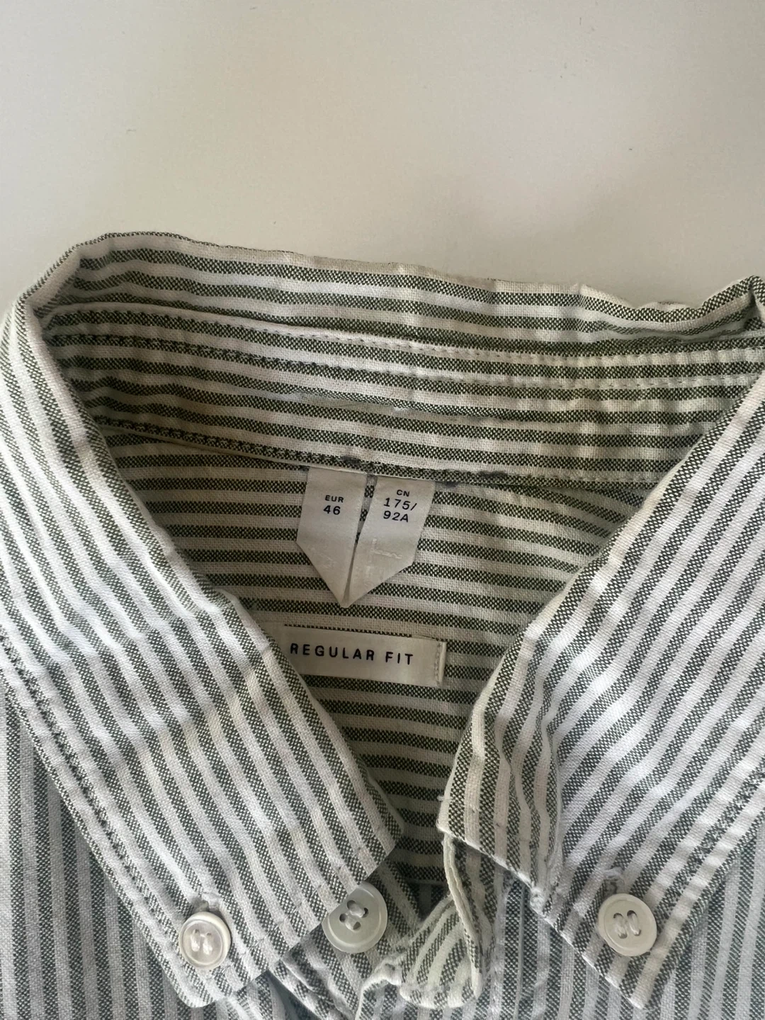 291A gently used shirt in a striped pattern. It's a regular fit and size 46. Perfect for a casual look! Heavy cotton as well, fits M-L