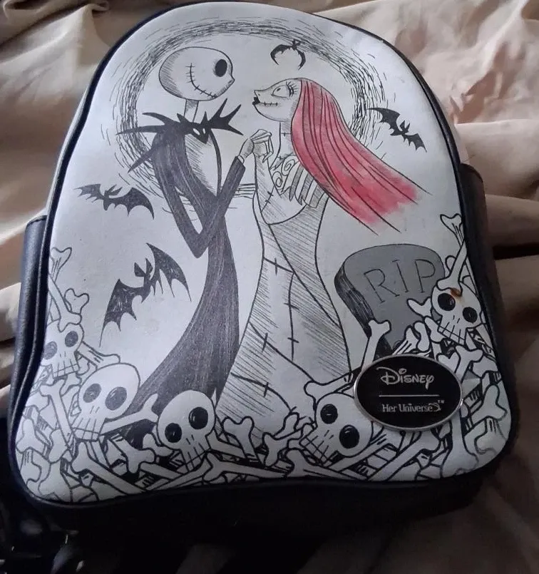 This mini backpack features Jack and Sally from The Nightmare Before Christmas with a graveyard scene. It's made by Disney and Her Universe. It's a great accessory for fans!