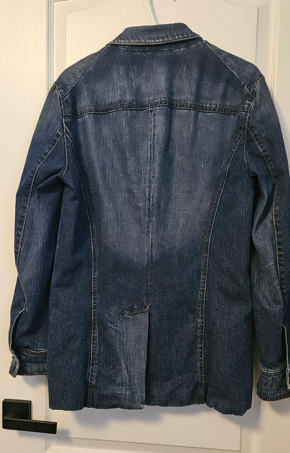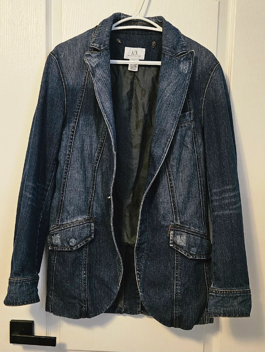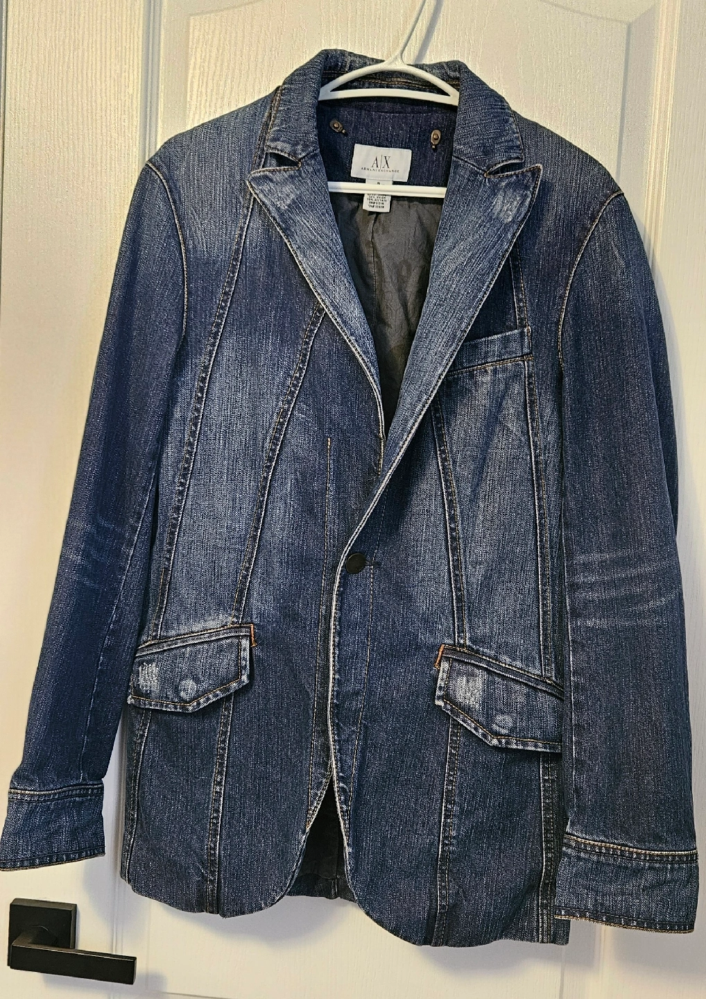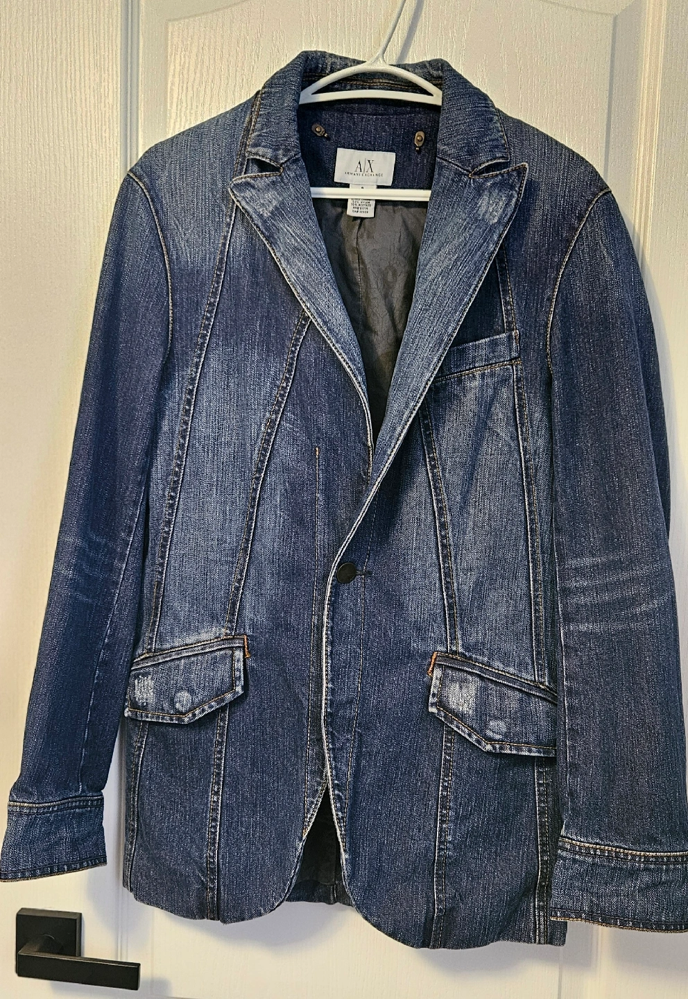 Selling a used Armani Exchange denim blazer with lining size small. It's a stylish piece that adds a unique touch to any outfit. The blazer is in good condition and ready for a new home!
