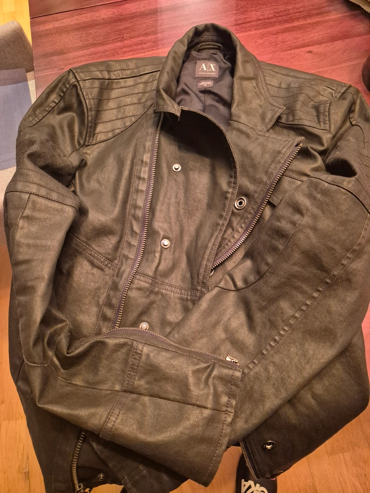 17Selling an Armani Exchange jacket in good condition. It features a unique design with zipper and button closures. Perfect for adding a stylish touch to your wardrobe!