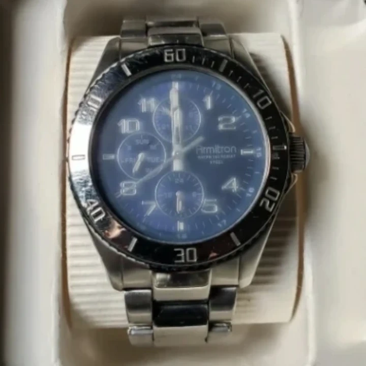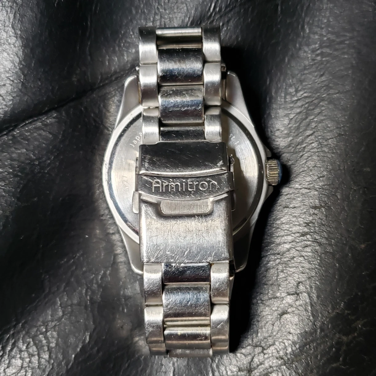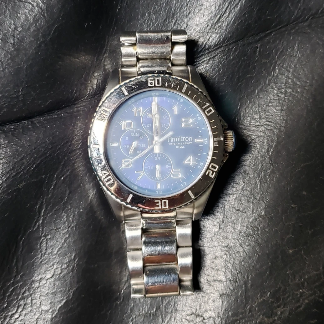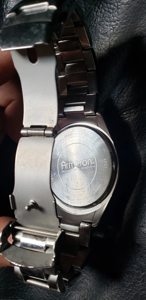 Selling a used men's Armitron watch in stainless steel. It's in good working condition but has some minor wear as visible in picks. New battery recently installed as of October 2nd. Back plate needs to be installed as I haven't been able to get it to close properly. Pickup only. Public meet up located at Campbell Avenue and Wallace ave intersection in Toronto's west end Junction area.