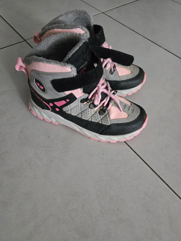 10Selling a pair of Armix winter boots for kids! They're a size 4.5 (US/CA). These boots are perfect for keeping little feet warm and dry during the winter months. They feature a grey and pink colour scheme with black accents and a velcro strap for easy fastening. They also have laces for a snug fit! Size EU 34