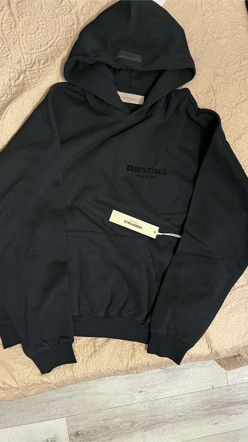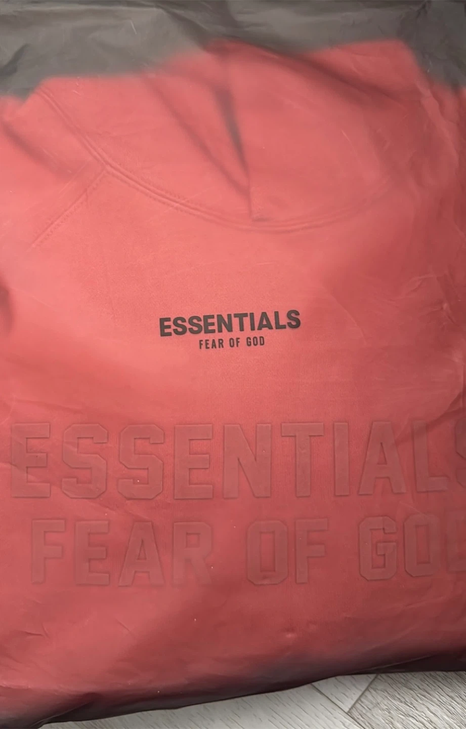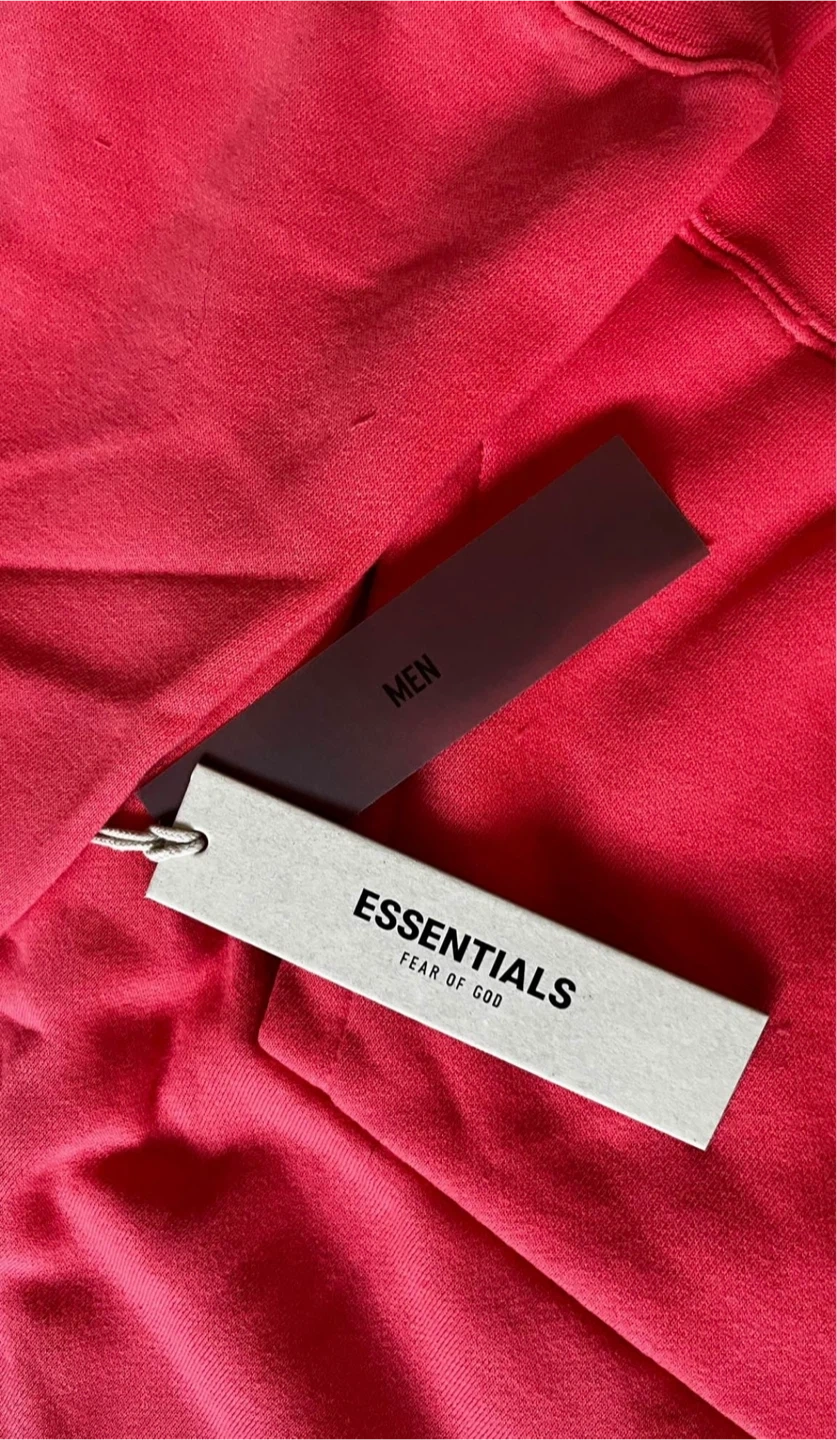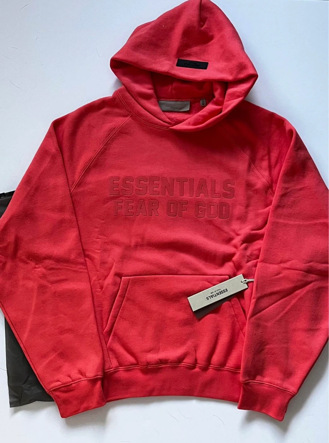 This is a red Essentials Fear of God hoodie. It's made of a comfortable cotton blend and features embossed branding. Includes original tags and packaging.