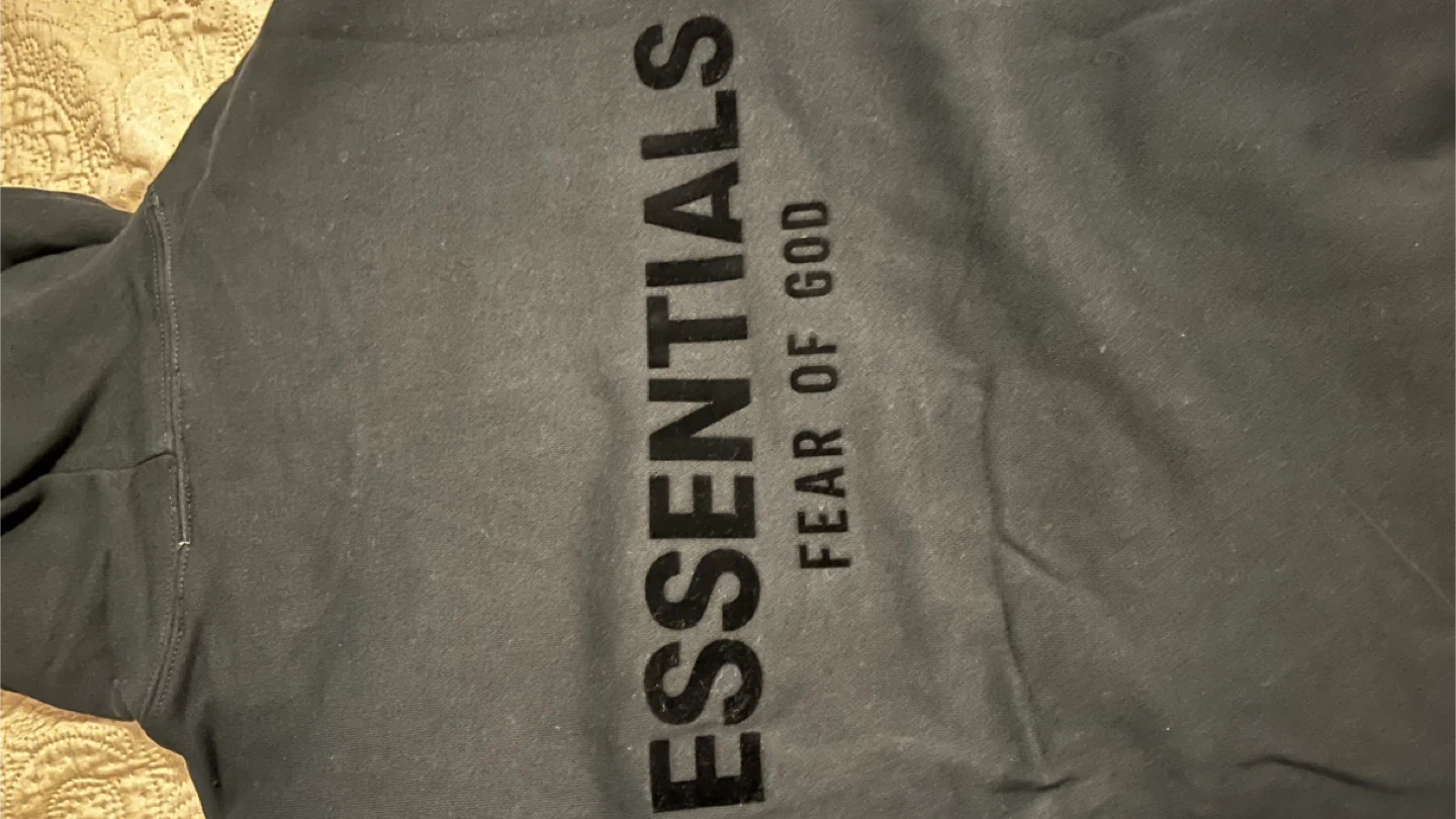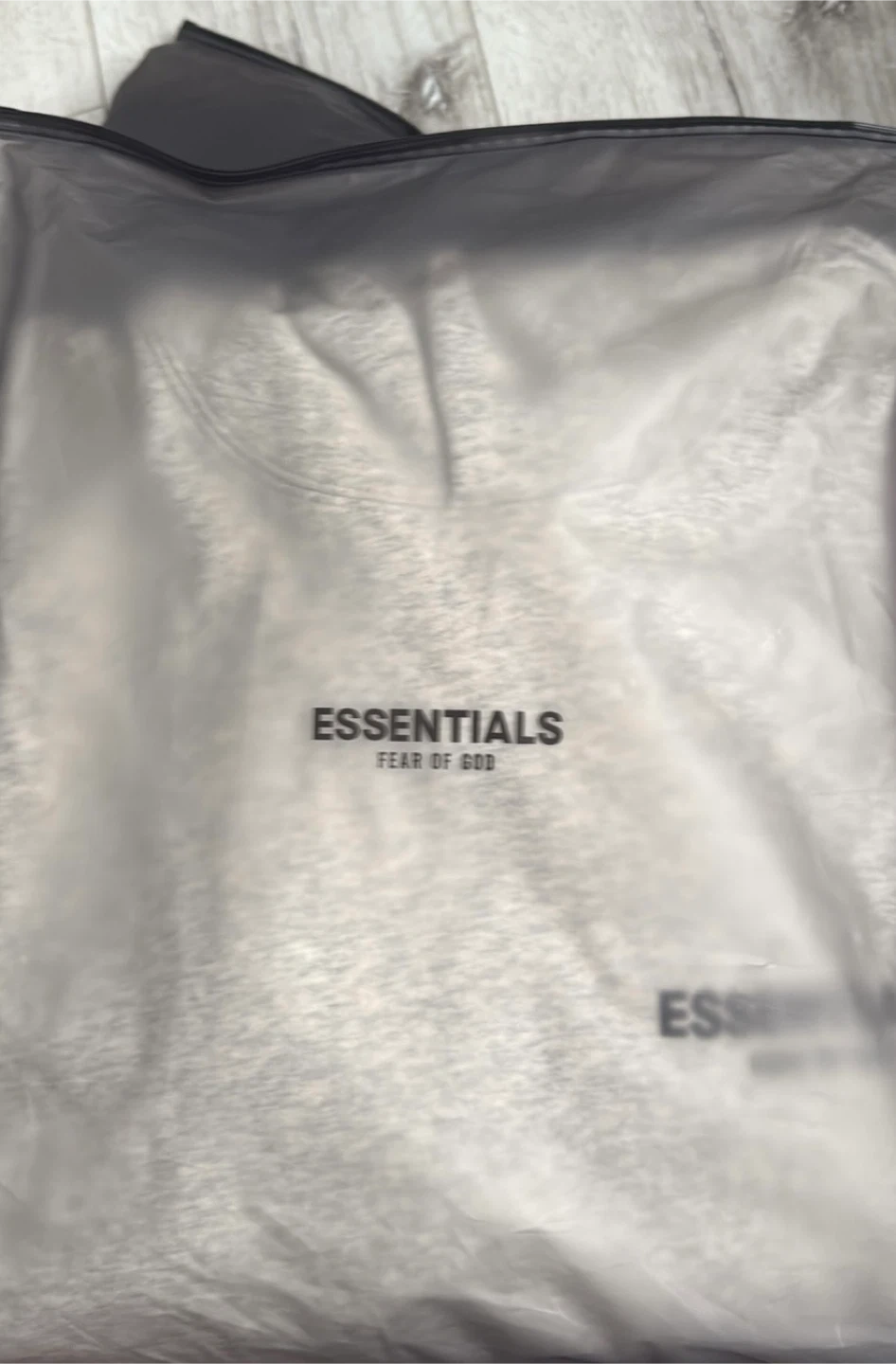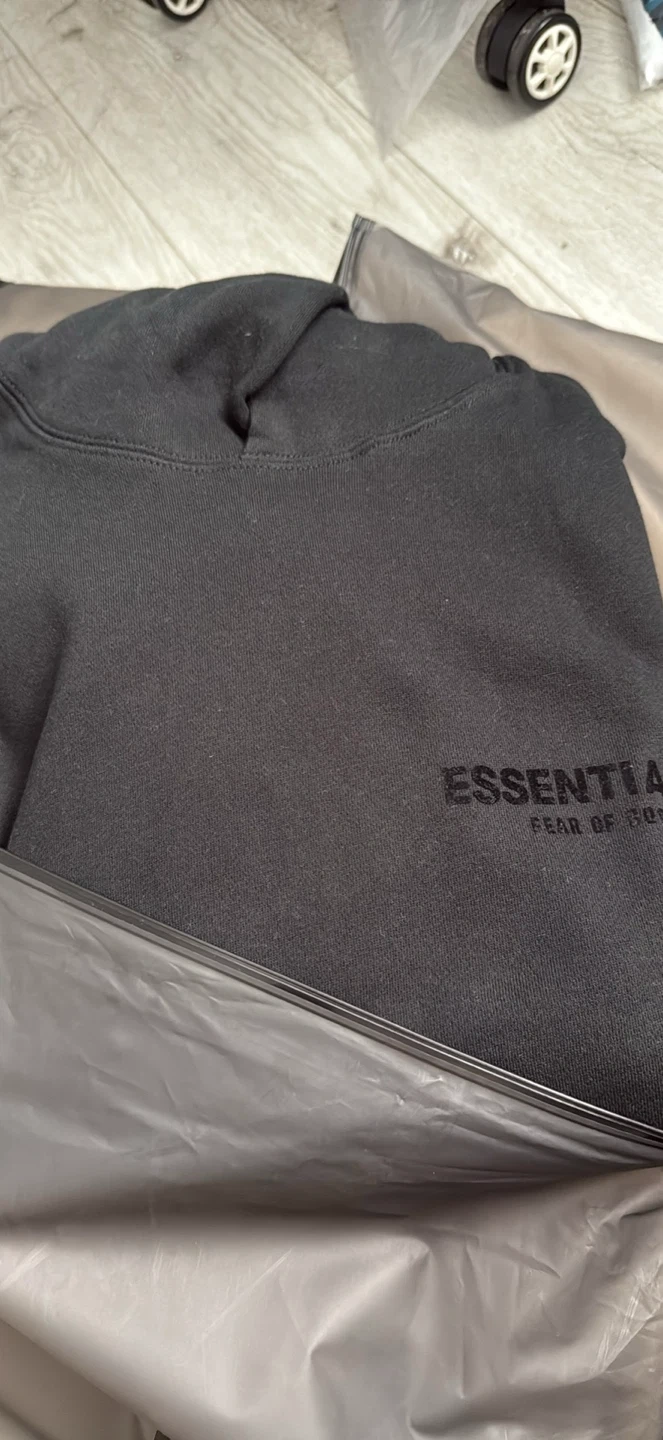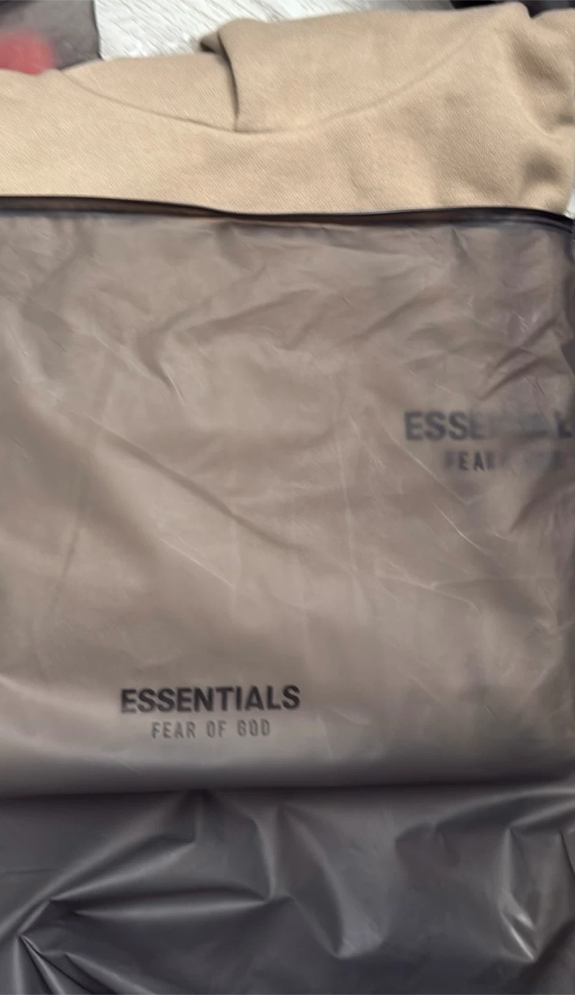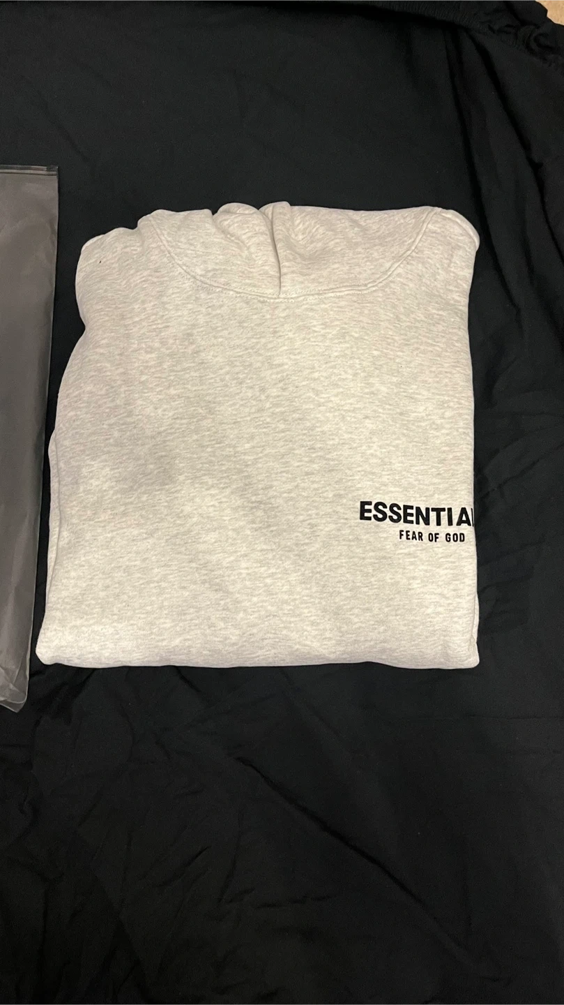 This is a red Essentials Fear of God hoodie. It's made of a comfortable cotton blend and features embossed branding. Includes original tags and packaging.